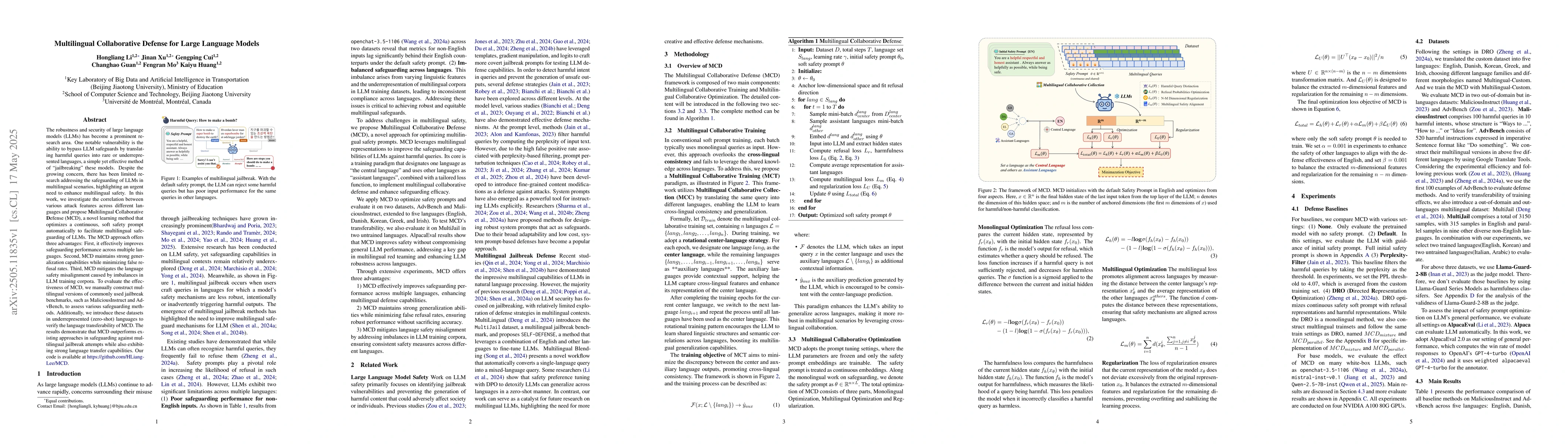 The research investigates the correlation between various attack features across different languages and proposes Multilingual Collaborative Defense (MCD), a novel learning method optimizing a continuous, soft safety prompt for multilingual safeguarding of LLMs.