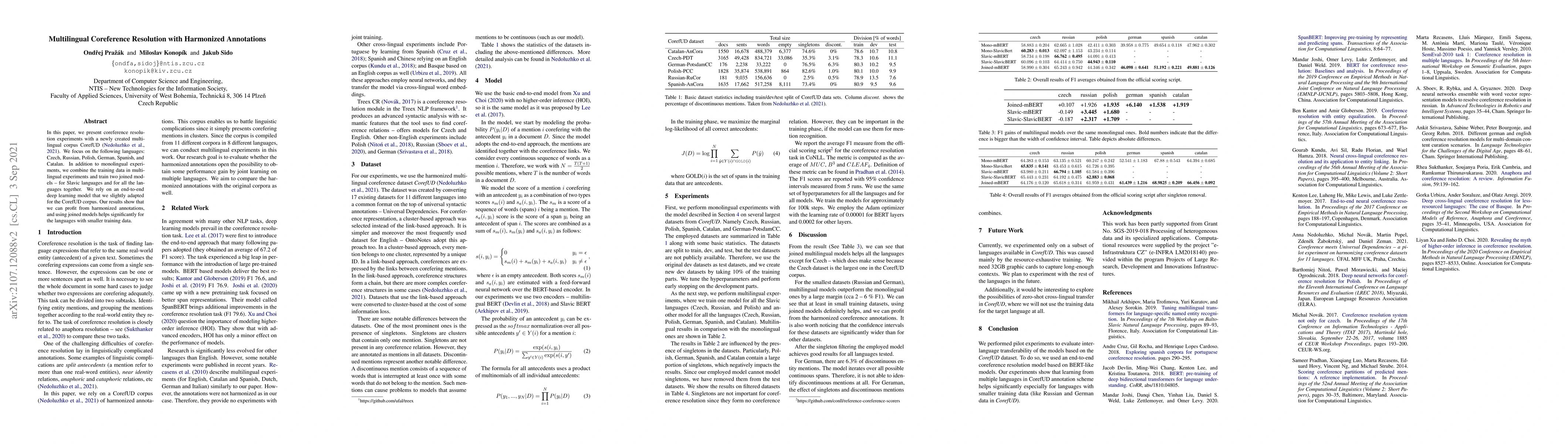 This paper explores multilingual coreference resolution using a new corpus CorefUD, focusing on Czech, Russian, Polish, German, Spanish, and Catalan. It demonstrates that combining training data in multilingual models, especially for languages with limited data, significantly improves performance through harmonized annotations.