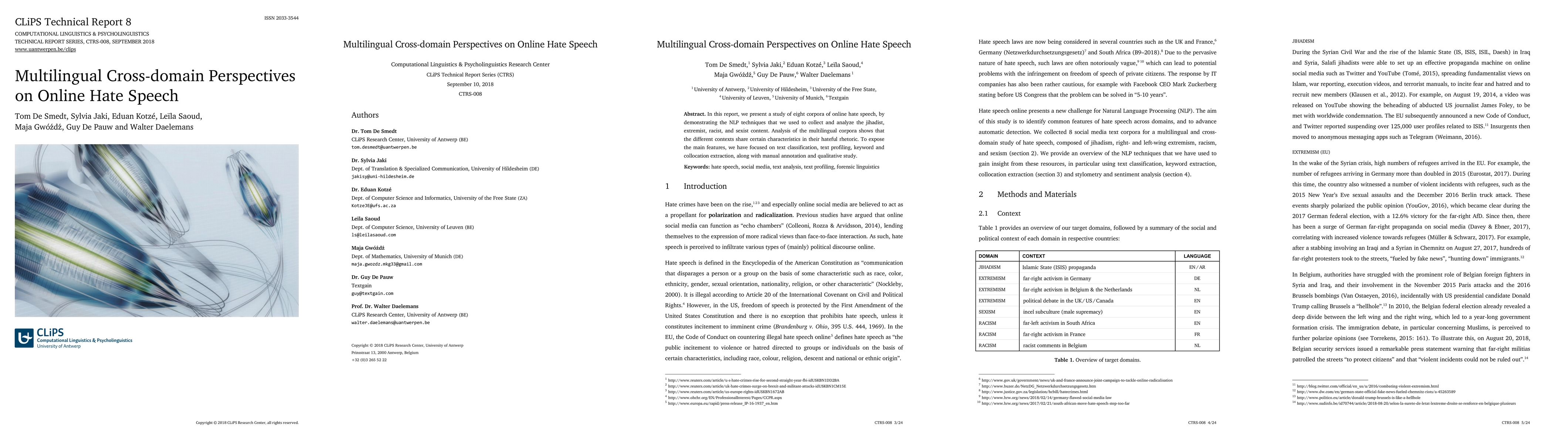 In this report, we present a study of eight corpora of online hate speech, by demonstrating the NLP techniques that we used to collect and analyze the jihadist, extremist, racist, and sexist content. Analysis of the multilingual corpora shows that the different contexts share certain characteristics in their hateful rhetoric. To expose the main features, we have focused on text classification, text profiling, keyword and collocation extraction, along with manual annotation and qualitative study.