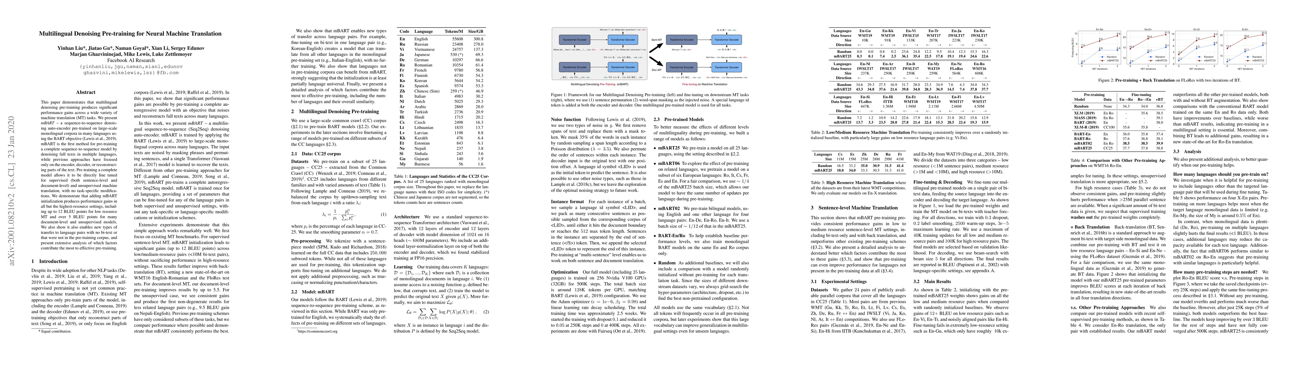 This paper introduces mBART, a denoising pre-trained sequence-to-sequence model for neural machine translation, showing significant performance gains across diverse MT tasks. The method enables direct fine-tuning for both supervised and unsupervised translation, achieving up to 12 BLEU points improvement in low-resource settings.