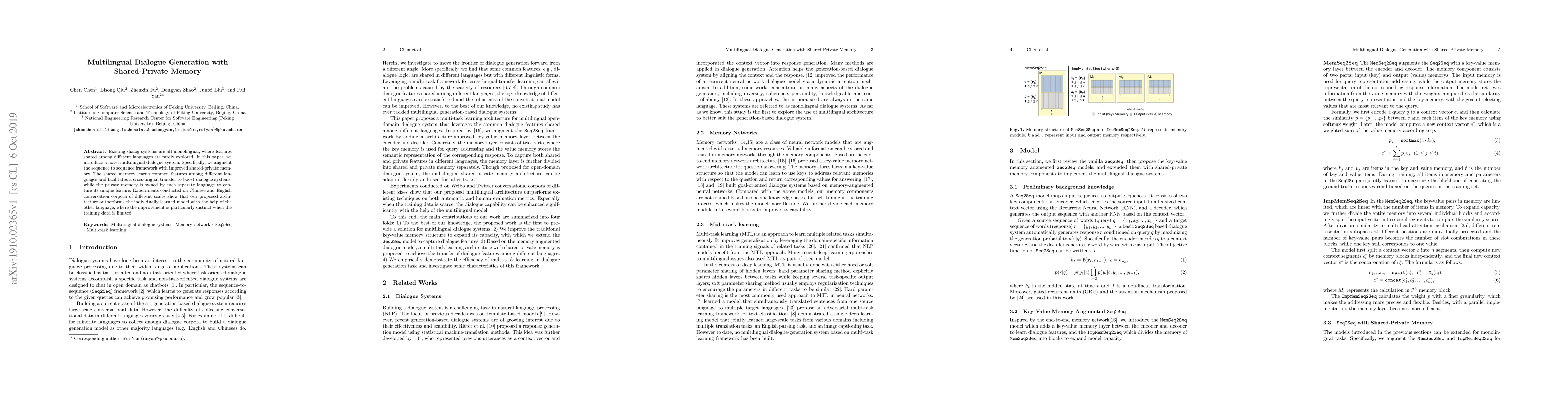 This paper proposes a multilingual dialogue system that uses shared-private memory to learn common features across languages and capture unique language-specific features. Experiments demonstrate significant improvements over monolingual models, especially in low-data scenarios.