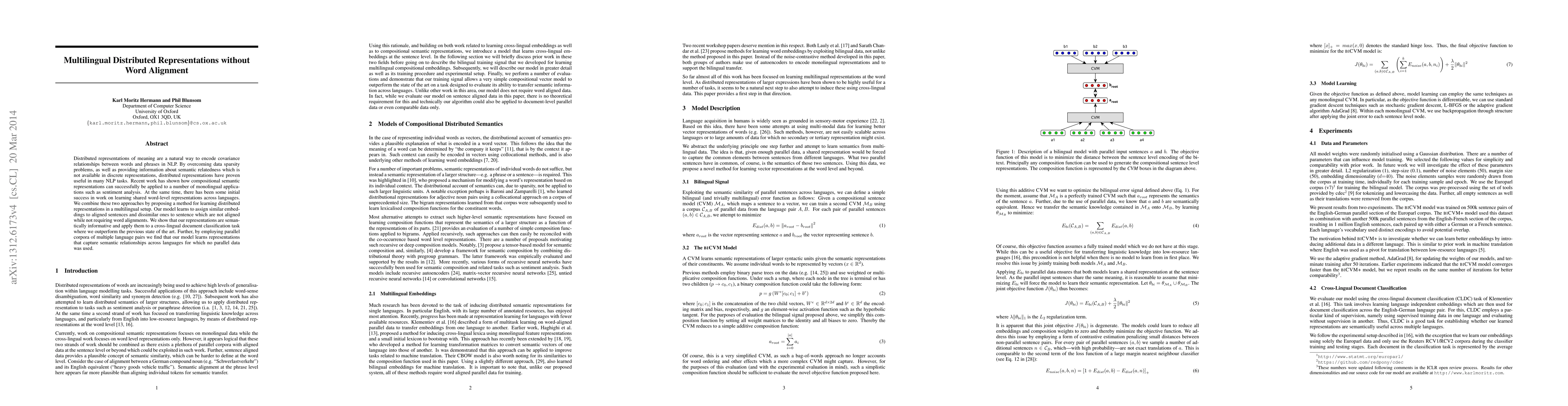 This paper proposes a method for learning multilingual distributed representations without requiring word alignments, showing that the representations are semantically informative and outperform previous models in cross-lingual document classification. The model captures semantic relationships across languages even for those without parallel data.