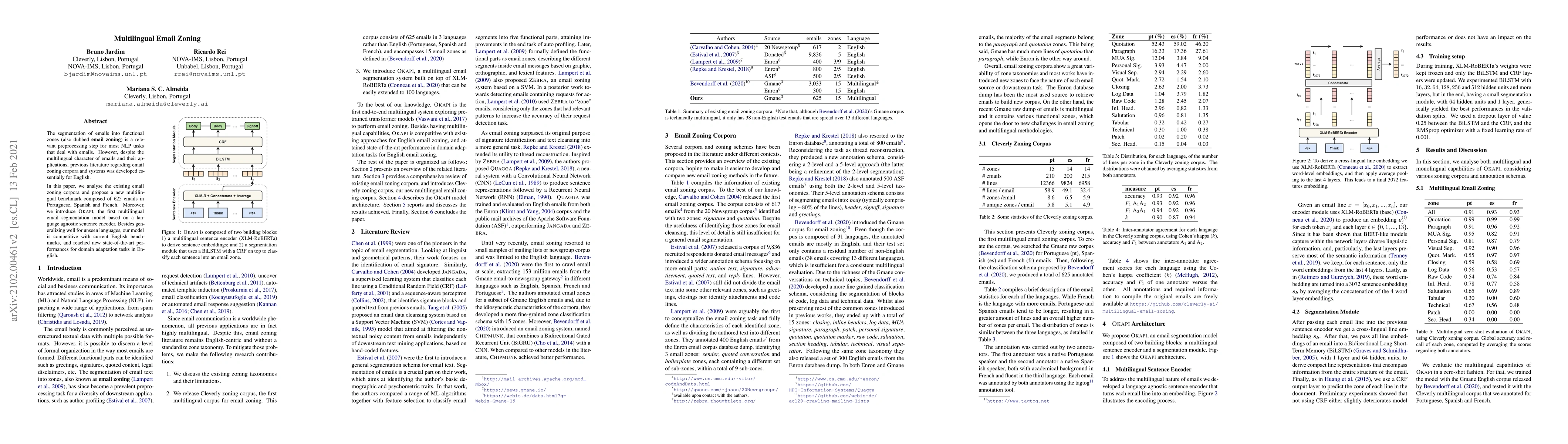 The segmentation of emails into functional zones (also dubbed email zoning) is a relevant preprocessing step for most NLP tasks that deal with emails. However, despite the multilingual character of emails and their applications, previous literature regarding email zoning corpora and systems was developed essentially for English. In this paper, we analyse the existing email zoning corpora and propose a new multilingual benchmark composed of 625 emails in Portuguese, Spanish and French. Moreover, we introduce OKAPI, the first multilingual email segmentation model based on a language agnostic sentence encoder. Besides generalizing well for unseen languages, our model is competitive with current English benchmarks, and reached new state-of-the-art performances for domain adaptation tasks in English.