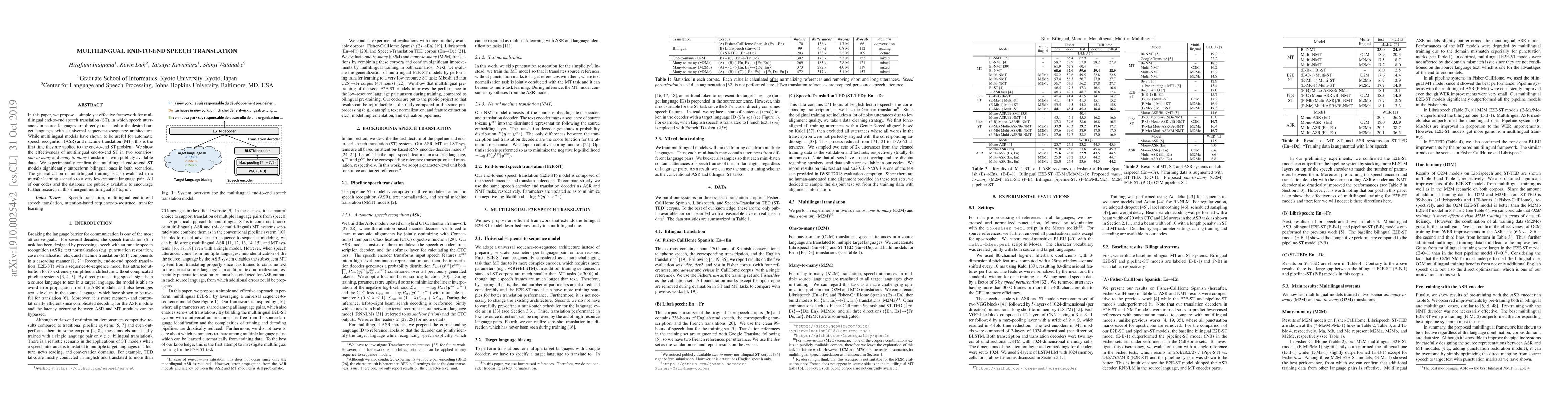 This paper introduces a framework for multilingual end-to-end speech translation using a universal sequence-to-sequence architecture, demonstrating superior performance compared to bilingual models in one-to-many and many-to-many translation scenarios. The study also explores multilingual training generalization in a low-resource language pair.