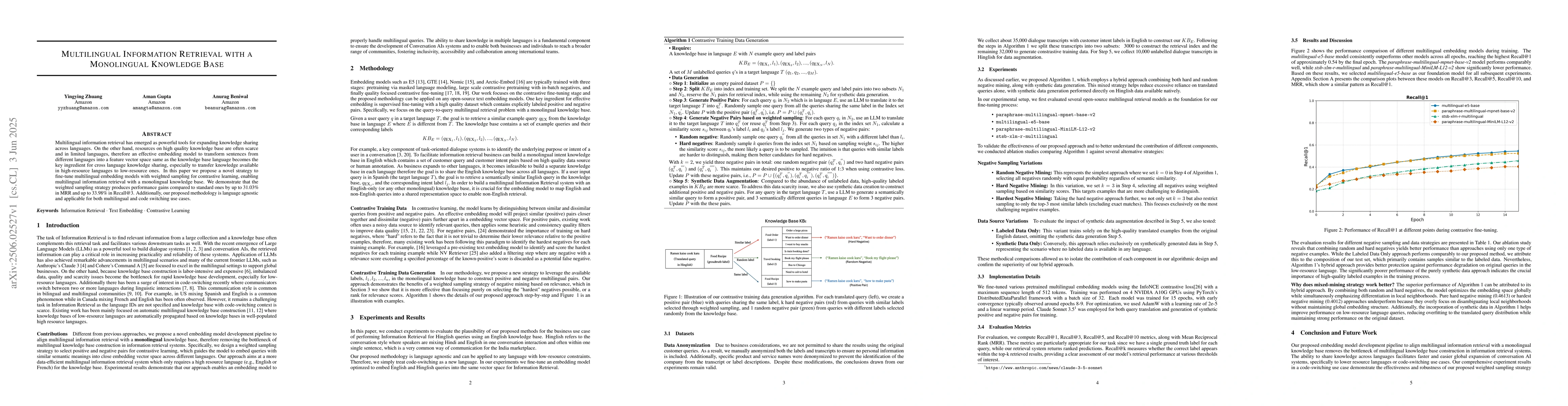 The paper proposes a novel strategy to fine-tune multilingual embedding models with weighted sampling for contrastive learning, facilitating multilingual information retrieval using a monolingual knowledge base.