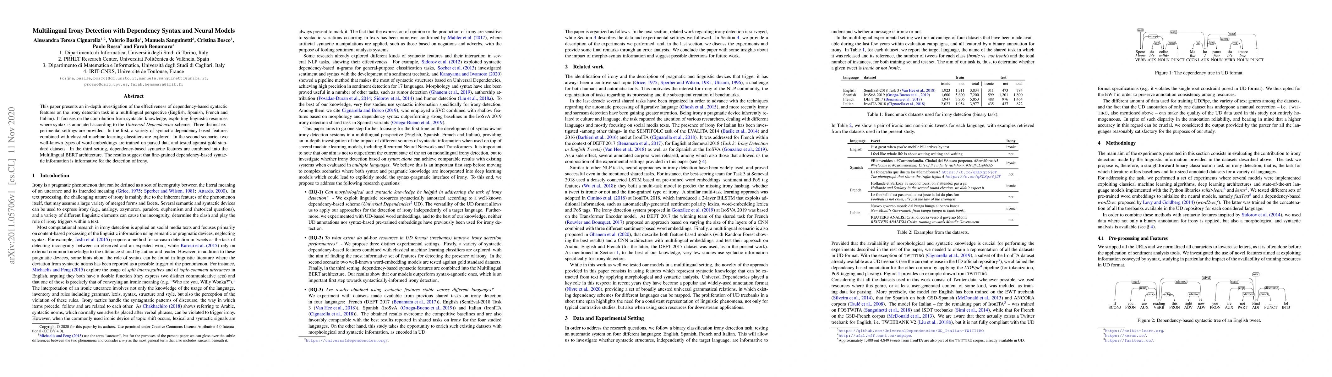 This paper presents an in-depth investigation of the effectiveness of dependency-based syntactic features on the irony detection task in a multilingual perspective (English, Spanish, French and Italian). It focuses on the contribution from syntactic knowledge, exploiting linguistic resources where syntax is annotated according to the Universal Dependencies scheme. Three distinct experimental settings are provided. In the first, a variety of syntactic dependency-based features combined with classical machine learning classifiers are explored. In the second scenario, two well-known types of word embeddings are trained on parsed data and tested against gold standard datasets. In the third setting, dependency-based syntactic features are combined into the Multilingual BERT architecture. The results suggest that fine-grained dependency-based syntactic information is informative for the detection of irony.