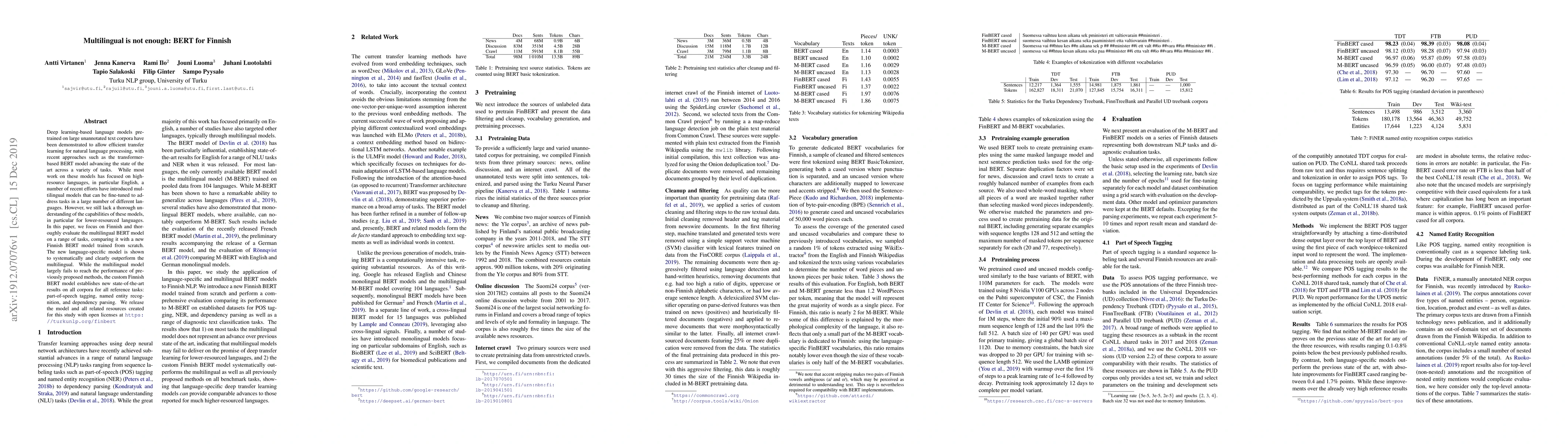 Deep learning-based language models pretrained on large unannotated text corpora have been demonstrated to allow efficient transfer learning for natural language processing, with recent approaches such as the transformer-based BERT model advancing the state of the art across a variety of tasks. While most work on these models has focused on high-resource languages, in particular English, a number of recent efforts have introduced multilingual models that can be fine-tuned to address tasks in a large number of different languages. However, we still lack a thorough understanding of the capabilities of these models, in particular for lower-resourced languages. In this paper, we focus on Finnish and thoroughly evaluate the multilingual BERT model on a range of tasks, comparing it with a new Finnish BERT model trained from scratch. The new language-specific model is shown to systematically and clearly outperform the multilingual. While the multilingual model largely fails to reach the performance of previously proposed methods, the custom Finnish BERT model establishes new state-of-the-art results on all corpora for all reference tasks: part-of-speech tagging, named entity recognition, and dependency parsing. We release the model and all related resources created for this study with open licenses at https://turkunlp.org/finbert .