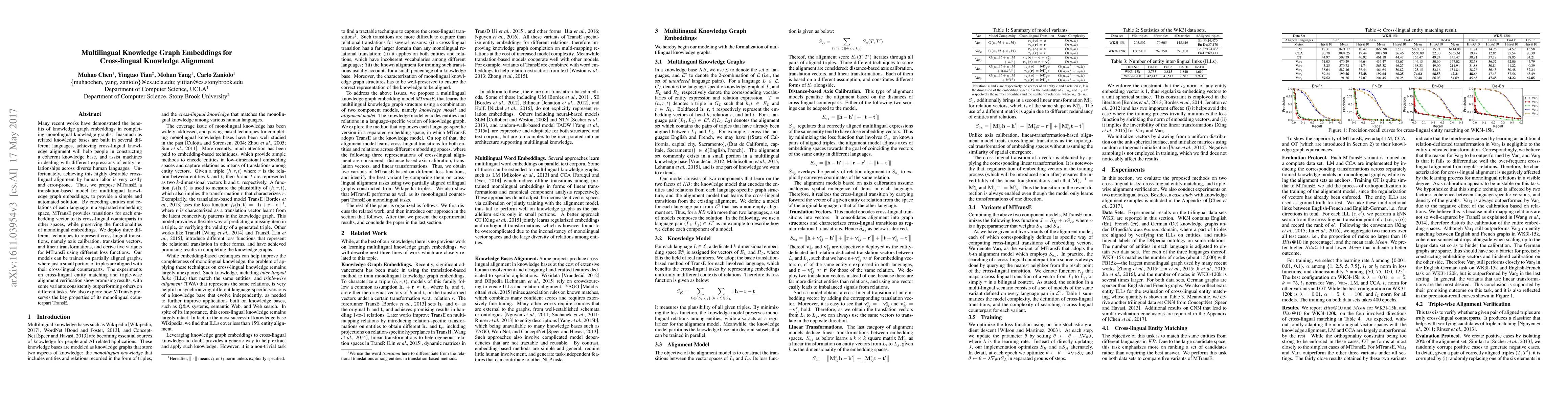 The paper proposes MTransE, a translation-based model for multilingual knowledge graph embeddings that facilitates automated cross-lingual knowledge alignment, using techniques like axis calibration, translation vectors, and linear transformations. Experiments demonstrate MTransE's effectiveness in cross-lingual entity matching and alignment verification, while preserving monolingual embedding properties.