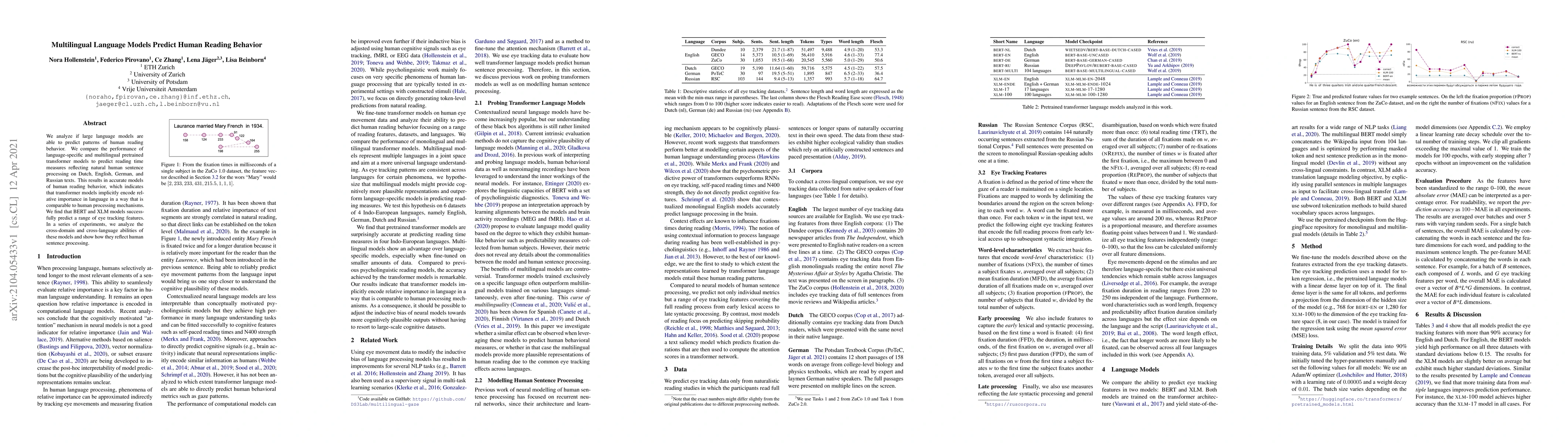 This study investigates whether large language models can predict human reading behavior across multiple languages. Results show that multilingual transformer models like BERT and XLM accurately predict eye tracking features, indicating they encode language importance similarly to humans.