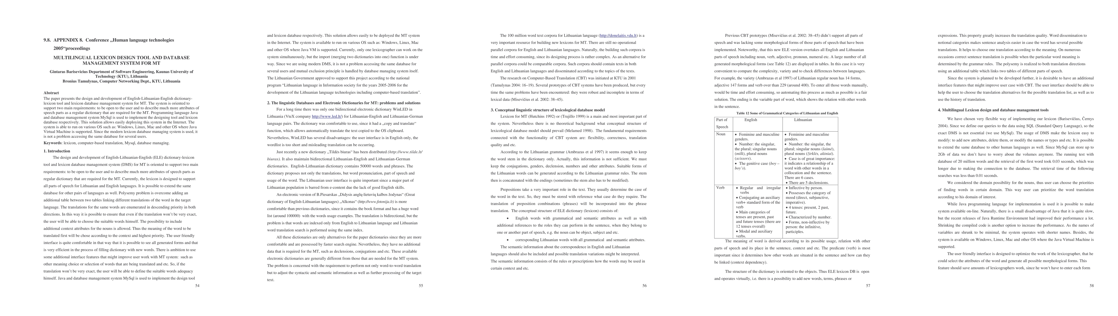 A multilingual dictionary design tool and database management system for machine translation (MT) has been developed to support diverse attributes of speech parts in various operating systems.