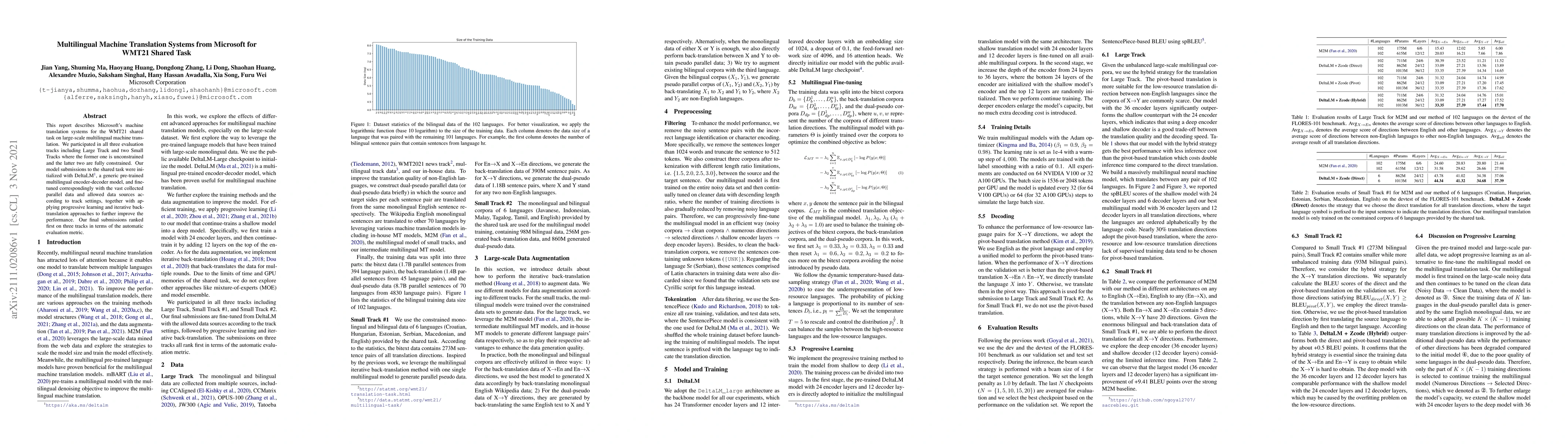Microsoft's machine translation systems for the WMT21 shared task utilized DeltaLM, a pre-trained multilingual model, fine-tuned with parallel data and progressive learning, achieving top rankings in three tracks including Large and two Small Tracks.