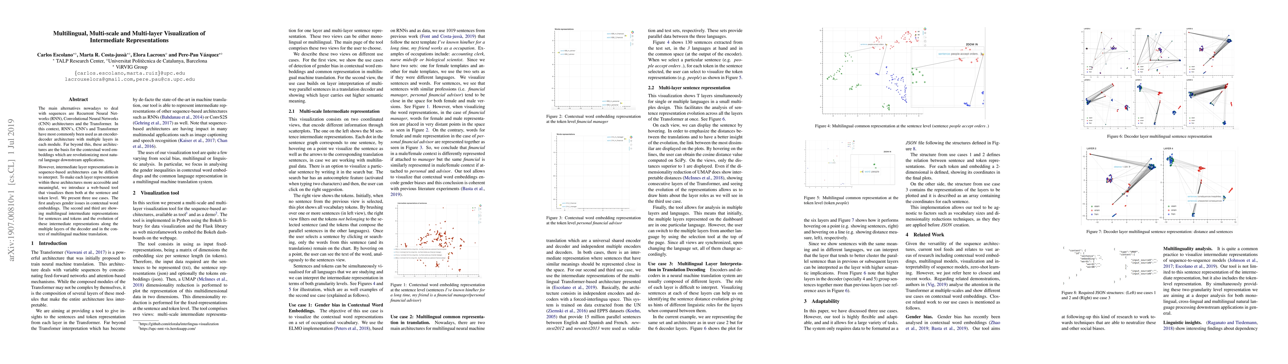 The main alternatives nowadays to deal with sequences are Recurrent Neural Networks (RNN), Convolutional Neural Networks (CNN) architectures and the Transformer. In this context, RNN's, CNN's and Transformer have most commonly been used as an encoder-decoder architecture with multiple layers in each module. Far beyond this, these architectures are the basis for the contextual word embeddings which are revolutionizing most natural language downstream applications. However, intermediate layer representations in sequence-based architectures can be difficult to interpret. To make each layer representation within these architectures more accessible and meaningful, we introduce a web-based tool that visualizes them both at the sentence and token level. We present three use cases. The first analyses gender issues in contextual word embeddings. The second and third are showing multilingual intermediate representations for sentences and tokens and the evolution of these intermediate representations along the multiple layers of the decoder and in the context of multilingual machine translation.