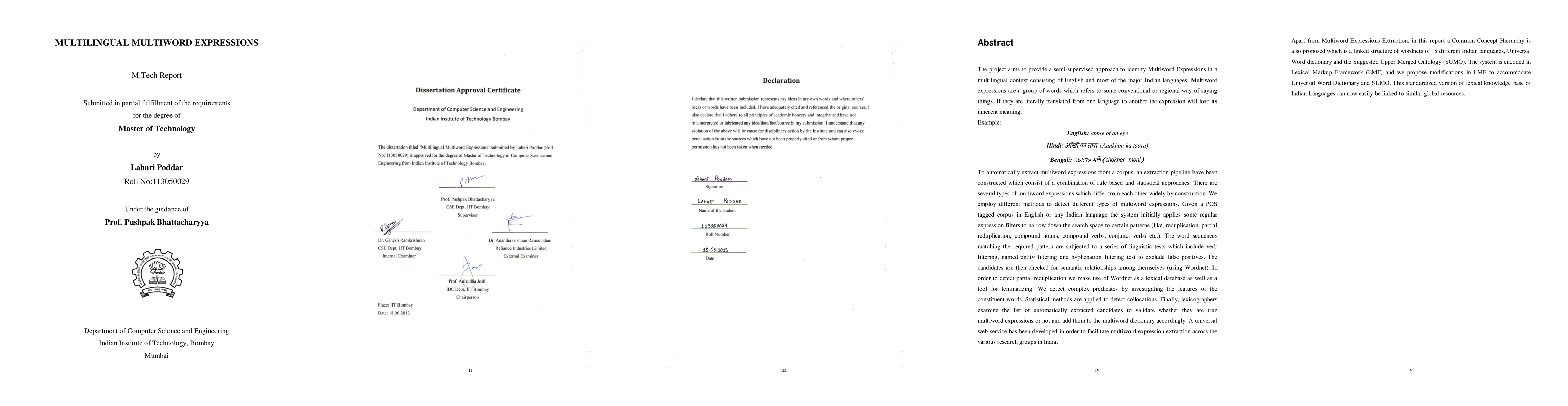 The project aims to provide a semi-supervised approach to identify Multiword Expressions in a multilingual context consisting of English and most of the major Indian languages. Multiword expressions are a group of words which refers to some conventional or regional way of saying things. If they are literally translated from one language to another the expression will lose its inherent meaning. To automatically extract multiword expressions from a corpus, an extraction pipeline have been constructed which consist of a combination of rule based and statistical approaches. There are several types of multiword expressions which differ from each other widely by construction. We employ different methods to detect different types of multiword expressions. Given a POS tagged corpus in English or any Indian language the system initially applies some regular expression filters to narrow down the search space to certain patterns (like, reduplication, partial reduplication, compound nouns, compound verbs, conjunct verbs etc.). The word sequences matching the required pattern are subjected to a series of linguistic tests which include verb filtering, named entity filtering and hyphenation filtering test to exclude false positives. The candidates are then checked for semantic relationships among themselves (using Wordnet). In order to detect partial reduplication we make use of Wordnet as a lexical database as well as a tool for lemmatising. We detect complex predicates by investigating the features of the constituent words. Statistical methods are applied to detect collocations. Finally, lexicographers examine the list of automatically extracted candidates to validate whether they are true multiword expressions or not and add them to the multiword dictionary accordingly.