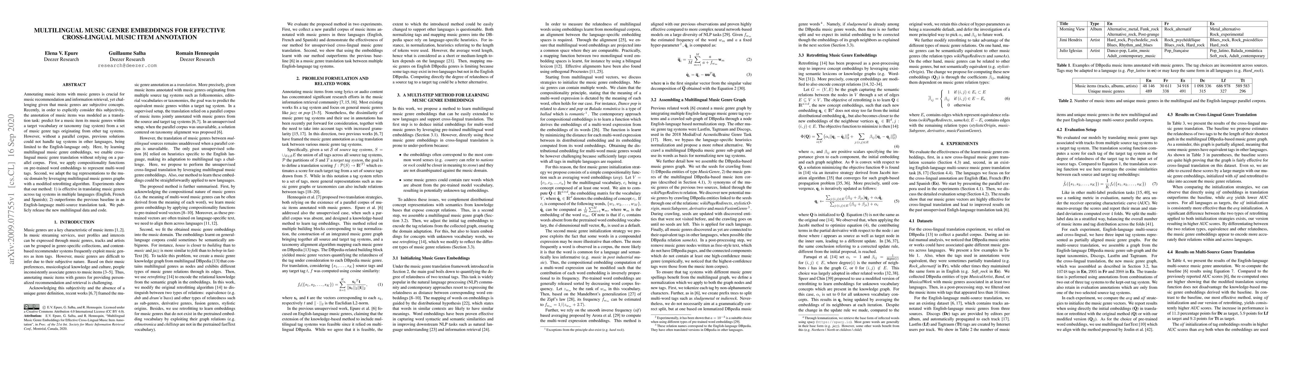 This paper proposes a method for multilingual music genre embeddings to enable cross-lingual music genre translation without a parallel corpus. The approach uses compositionality functions on pre-trained word embeddings and a modified retrofitting algorithm to adapt tag representations to the music domain, achieving effective genre translation across English, French, and Spanish.