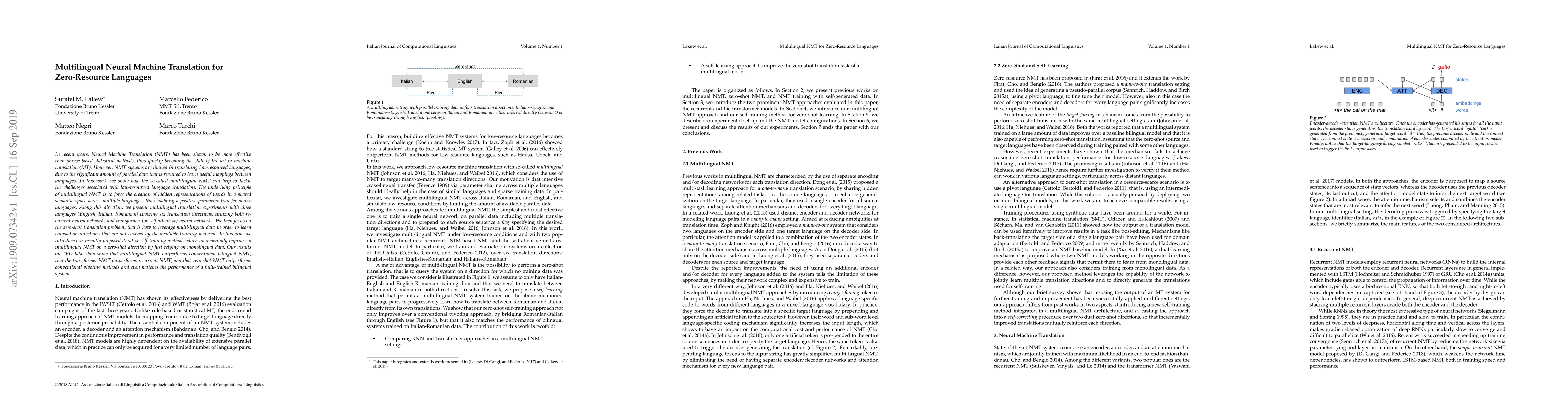 This paper explores how multilingual Neural Machine Translation (NMT) can address the challenges of low-resourced language translation by leveraging shared semantic spaces across languages. It demonstrates superior performance of transformer-based NMT over recurrent NMT and shows that zero-shot translation using an iterative self-training method can match the performance of fully-trained bilingual systems.