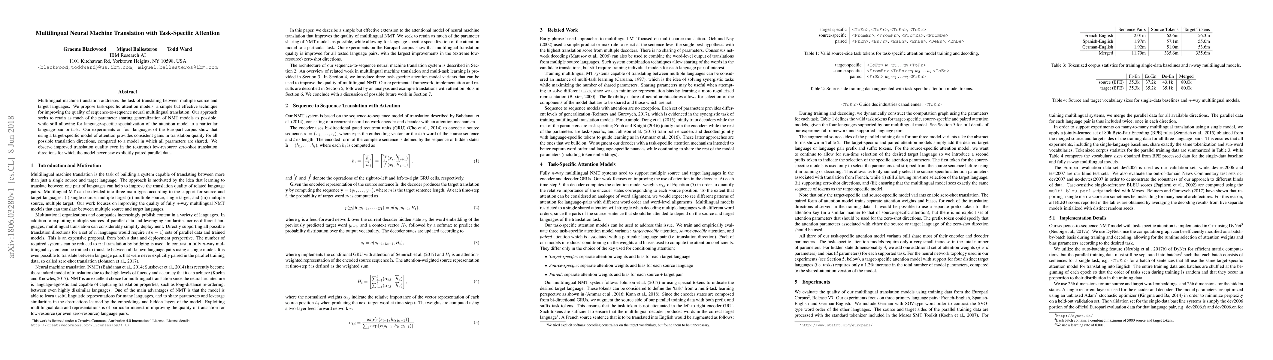 This paper proposes task-specific attention models to enhance multilingual neural machine translation, achieving better translation quality by allowing language-specific attention specialization. Experiments on the Europarl corpus demonstrate consistent improvements across all translation directions, including low-resource scenarios.
