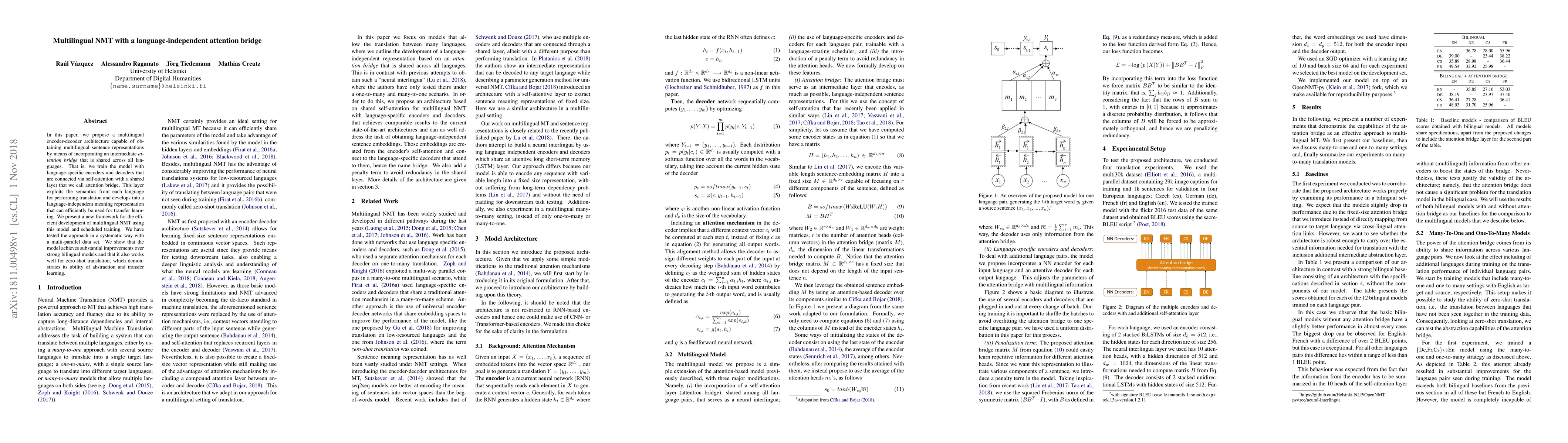 This paper introduces a multilingual neural machine translation (NMT) model with a shared attention bridge, enabling efficient transfer learning across languages. The model demonstrates significant improvements over bilingual models and shows effective zero-shot translation capabilities.