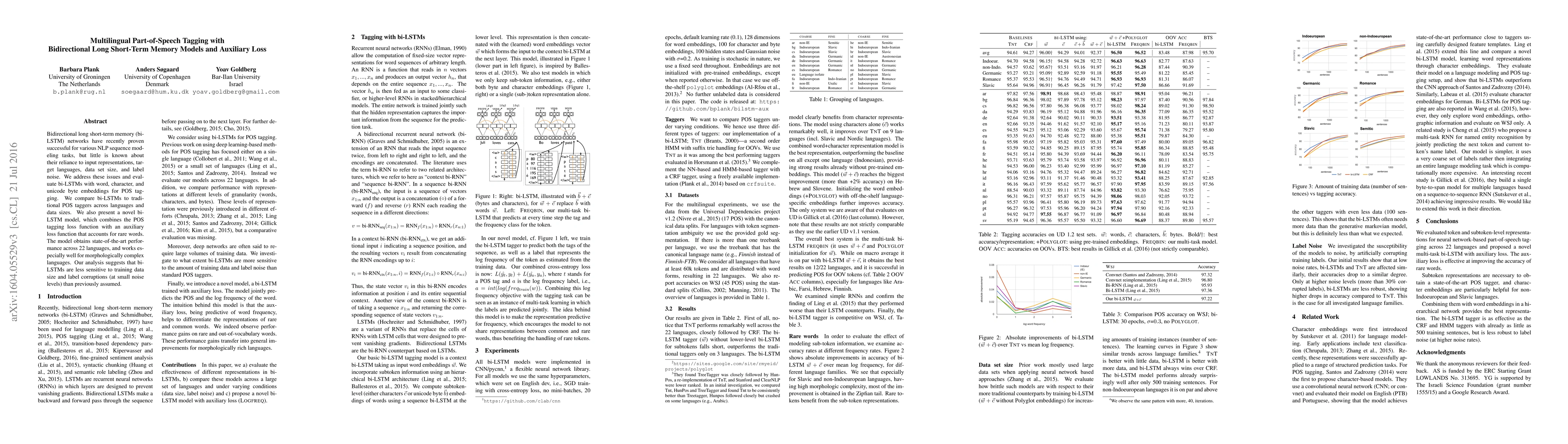 This paper investigates the effectiveness of bidirectional LSTM networks for multilingual part-of-speech tagging, comparing different input representations and evaluating their performance across various languages. The study introduces an auxiliary loss function that improves tagging for rare words, achieving state-of-the-art results and demonstrating reduced sensitivity to data size and label noise.