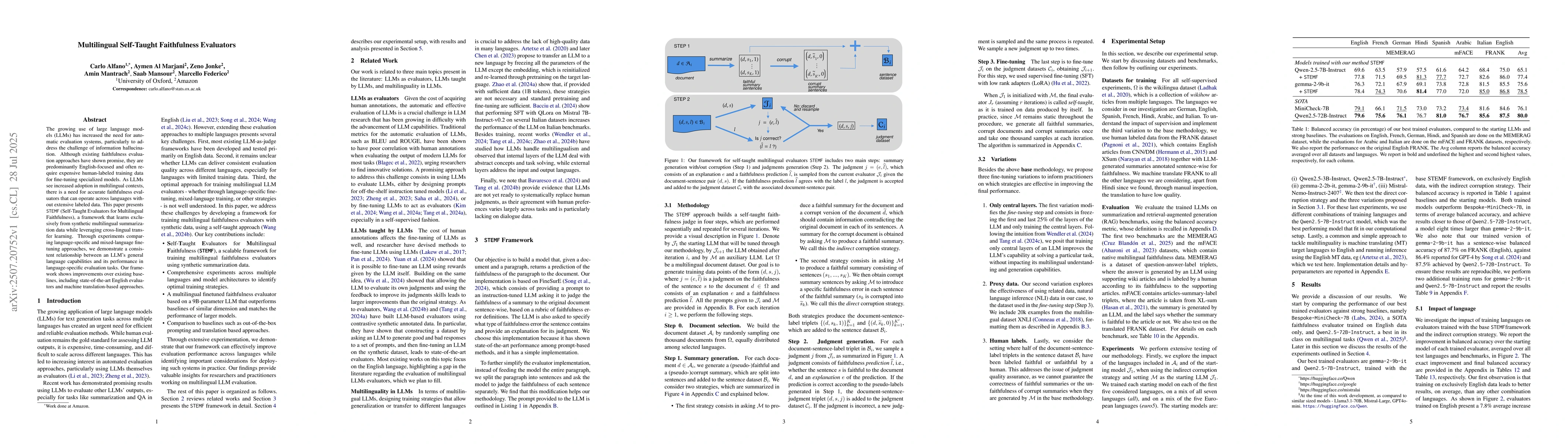 The growing use of large language models (LLMs) has increased the need for automatic evaluation systems, particularly to address the challenge of information hallucination. Although existing faithfulness evaluation approaches have shown promise, they are predominantly English-focused and often require expensive human-labeled training data for fine-tuning specialized models. As LLMs see increased adoption in multilingual contexts, there is a need for accurate faithfulness evaluators that can operate across languages without extensive labeled data. This paper presents Self-Taught Evaluators for Multilingual Faithfulness, a framework that learns exclusively from synthetic multilingual summarization data while leveraging cross-lingual transfer learning. Through experiments comparing language-specific and mixed-language fine-tuning approaches, we demonstrate a consistent relationship between an LLM's general language capabilities and its performance in language-specific evaluation tasks. Our framework shows improvements over existing baselines, including state-of-the-art English evaluators and machine translation-based approaches.