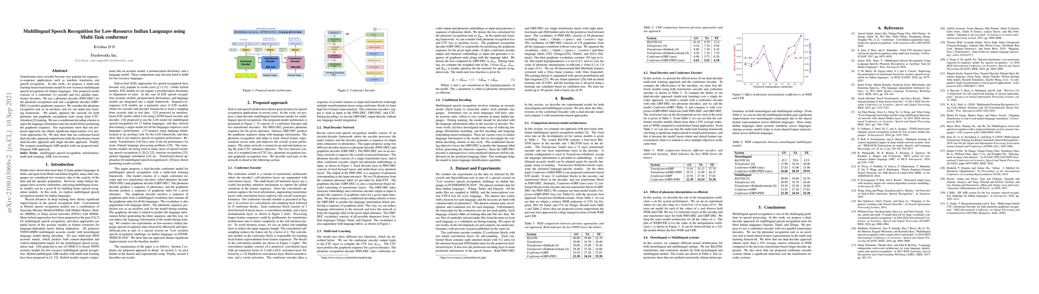 This paper proposes a multi-task learning-based transformer model, utilizing a conformer encoder and dual decoders, for low-resource multilingual speech recognition in Indian languages. The model achieves significant improvements over previous methods by jointly optimizing for phoneme and grapheme recognition tasks.