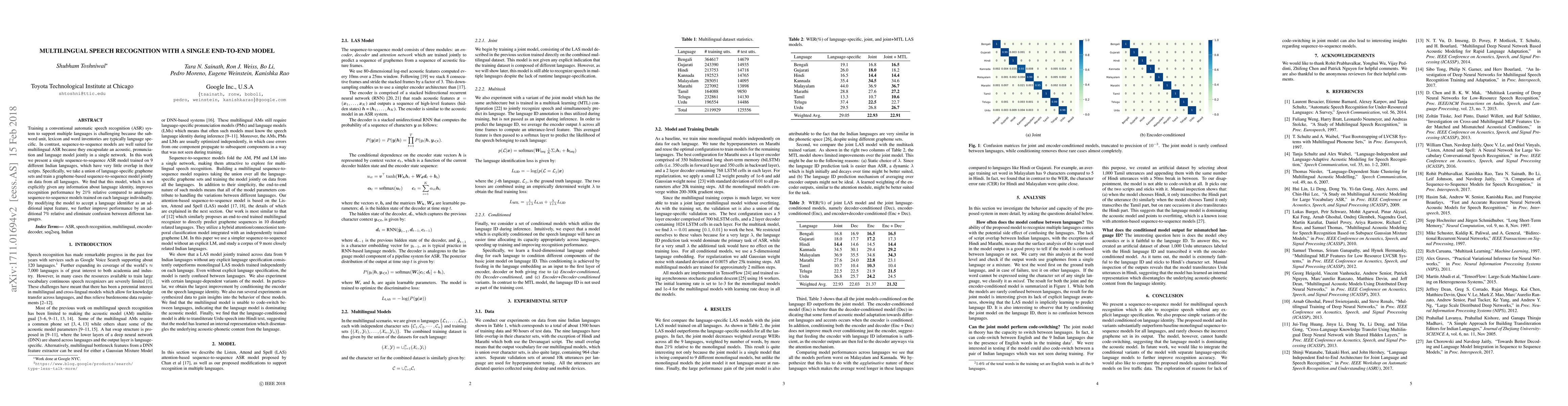 Training a conventional automatic speech recognition (ASR) system to support multiple languages is challenging because the sub-word unit, lexicon and word inventories are typically language specific. In contrast, sequence-to-sequence models are well suited for multilingual ASR because they encapsulate an acoustic, pronunciation and language model jointly in a single network. In this work we present a single sequence-to-sequence ASR model trained on 9 different Indian languages, which have very little overlap in their scripts. Specifically, we take a union of language-specific grapheme sets and train a grapheme-based sequence-to-sequence model jointly on data from all languages. We find that this model, which is not explicitly given any information about language identity, improves recognition performance by 21% relative compared to analogous sequence-to-sequence models trained on each language individually. By modifying the model to accept a language identifier as an additional input feature, we further improve performance by an additional 7% relative and eliminate confusion between different languages.