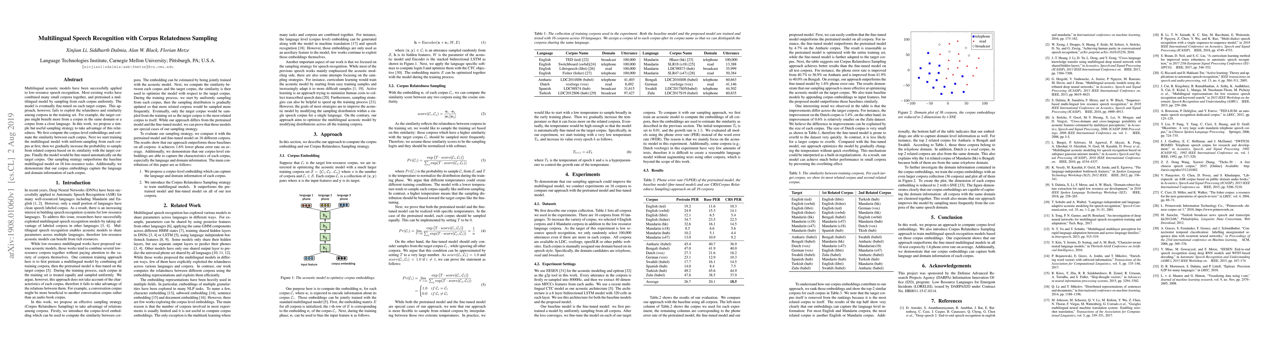 This paper proposes a corpus relatedness sampling strategy to enhance multilingual speech recognition in low-resource scenarios. The approach uses corpus embeddings to identify and prioritize related corpora during training, leading to improved performance over baseline models on 16 low-resource tasks.