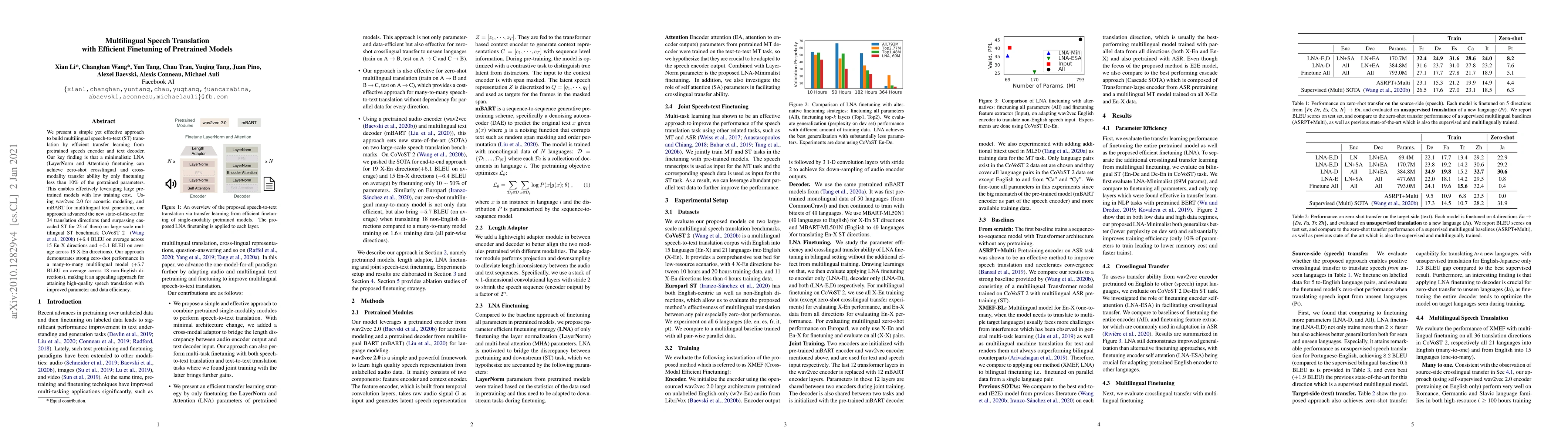 We present a simple yet effective approach to build multilingual speech-to-text (ST) translation by efficient transfer learning from pretrained speech encoder and text decoder. Our key finding is that a minimalistic LNA (LayerNorm and Attention) finetuning can achieve zero-shot crosslingual and cross-modality transfer ability by only finetuning less than 10% of the pretrained parameters. This enables effectively leveraging large pretrained models with low training cost. Using wav2vec 2.0 for acoustic modeling, and mBART for multilingual text generation, our approach advanced the new state-of-the-art for 34 translation directions (and surpassing cascaded ST for 23 of them) on large-scale multilingual ST benchmark CoVoST 2 (+6.4 BLEU on average across 15 En-X directions and +5.1 BLEU on average across 19 X-En directions). Our approach demonstrates strong zero-shot performance in a many-to-many multilingual model (+5.7 BLEU on average across 18 non-English directions), making it an appealing approach for attaining high-quality speech translation with improved parameter and data efficiency.
