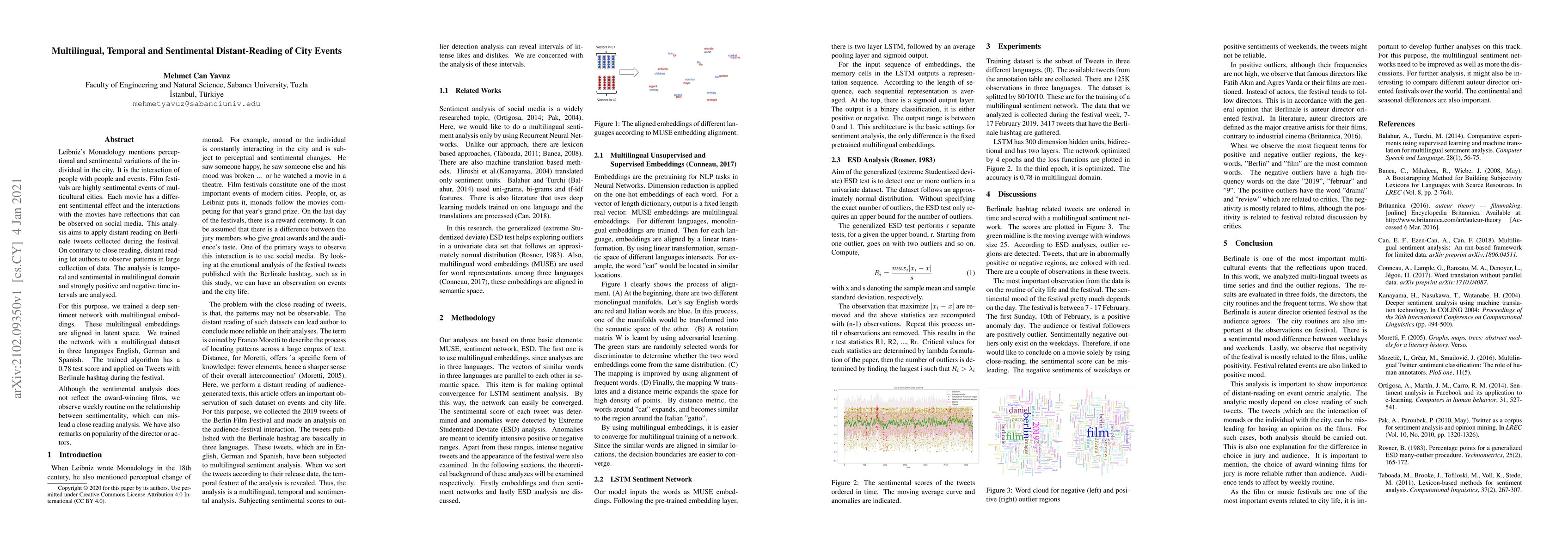 Leibniz's Monadology mentions perceptional and sentimental variations of the individual in the city. It is the interaction of people with people and events. Film festivals are highly sentimental events of multicultural cities. Each movie has a different sentimental effect and the interactions with the movies have reflections that can be observed on social media. This analysis aims to apply distant reading on Berlinale tweets collected during the festival. On contrary to close reading, distant reading let authors to observe patterns in large collection of data. The analysis is temporal and sentimental in multilingual domain and strongly positive and negative time intervals are analysed. For this purpose, we trained a deep sentiment network with multilingual embeddings. These multilingual embeddings are aligned in latent space. We trained the network with a multilingual dataset in three languages English, German and Spanish. The trained algorithm has a 0.78 test score and applied on Tweets with Berlinale hashtag during the festival. Although the sentimental analysis does not reflect the award-winning films, we observe weekly routine on the relationship between sentimentality, which can mislead a close reading analysis. We have also remarks on popularity of the director or actors.