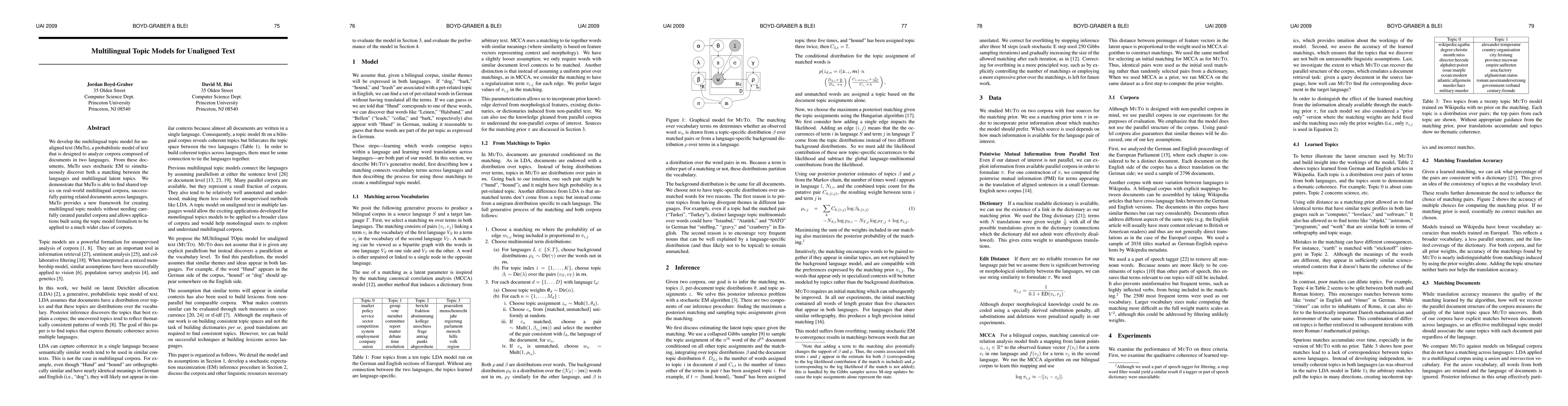 The paper introduces MuTo, a multilingual topic model for unaligned text that uses stochastic EM to discover matching languages and latent topics without parallel corpora. It demonstrates MuTo’s ability to find shared topics across languages in real-world datasets, expanding the applicability of multilingual topic models.
