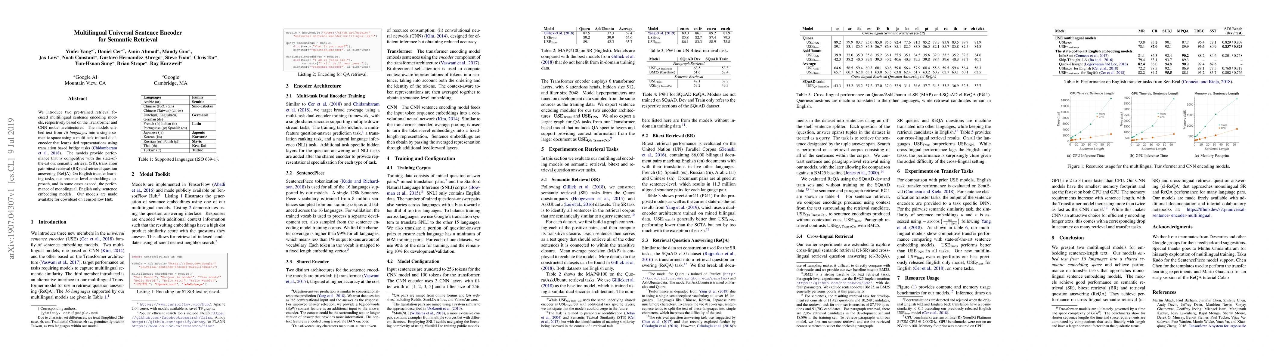 This paper presents two multilingual sentence encoder models based on Transformer and CNN architectures, designed for semantic retrieval across 16 languages. The models achieve competitive performance on various tasks, including semantic retrieval and question answering, and outperform some monolingual English models on English transfer tasks.