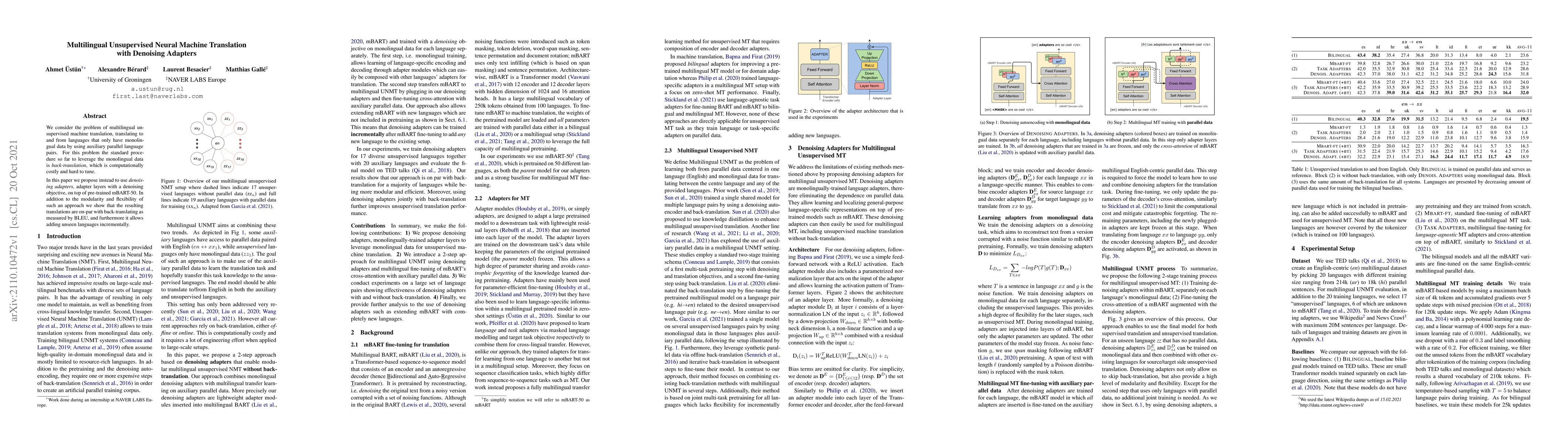This paper proposes using denoising adapters on top of pre-trained mBART-50 for multilingual unsupervised machine translation, offering a more flexible and efficient alternative to the computationally intensive back-translation method. The results show comparable translation quality as measured by BLEU and allow for the incremental addition of unseen languages.