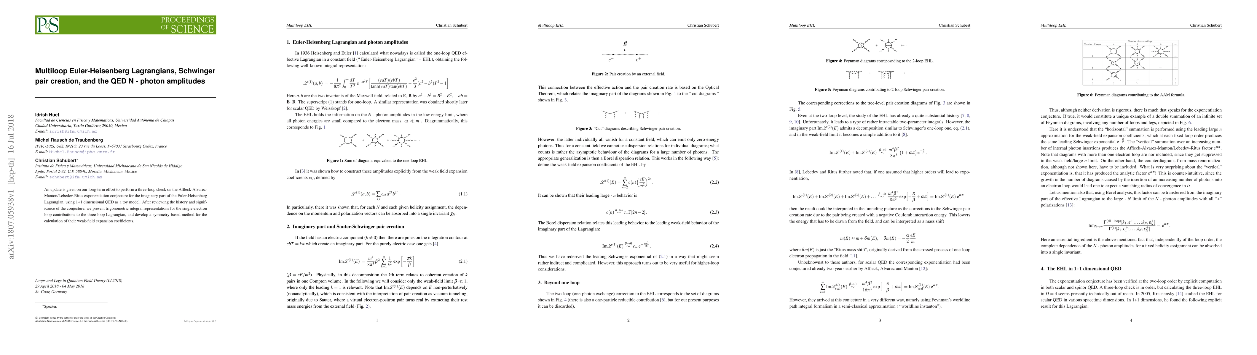 An update is given on our long-term effort to perform a three-loop check on the Affleck-Alvarez-Manton/Lebedev-Ritus exponentiation conjecture for the imaginary part of the Euler-Heisenberg Lagrangian, using 1+1 dimensional QED as a toy model. After reviewing the history and significance of the conjecture, we present trigonometric integral representations for the single electron loop contributions to the three-loop Lagrangian, and develop a symmetry-based method for the calculation of their weak-field expansion coefficients.