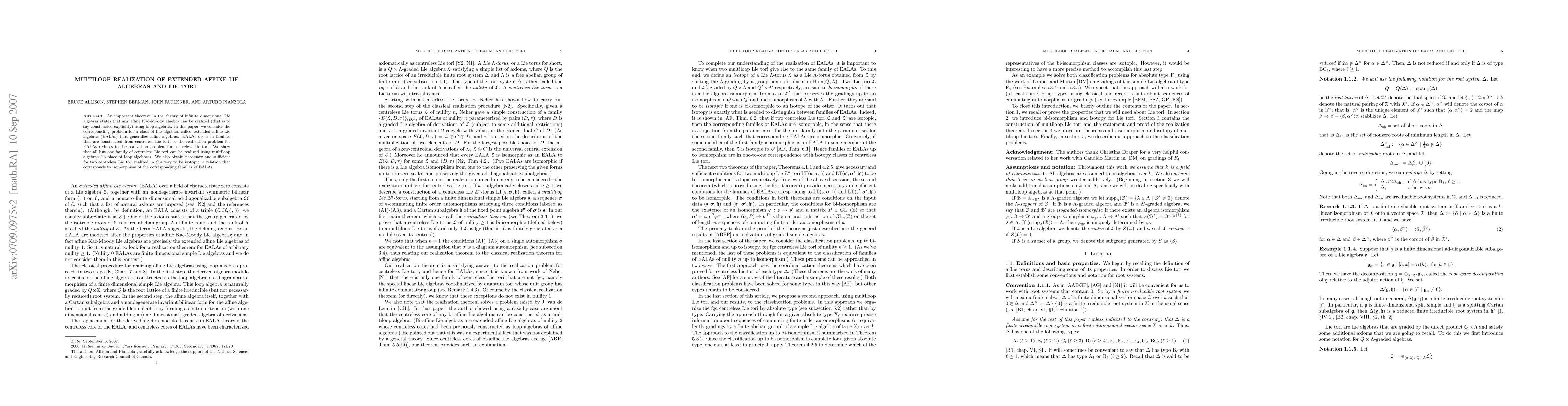This paper explores the realization of extended affine Lie algebras (EALAs) through multiloop algebras, demonstrating that most centreless Lie tori can be constructed this way. It also establishes criteria for isotopic realizations of centreless Lie tori, which correspond to isomorphic EALA families.