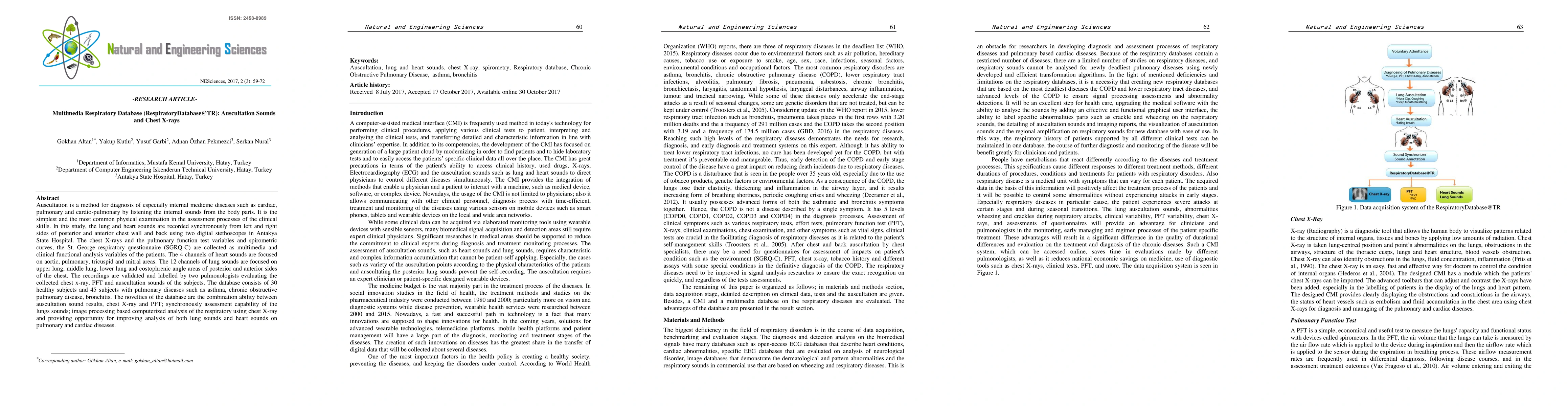 Auscultation is a method for diagnosis of especially internal medicine diseases such as cardiac, pulmonary and cardio-pulmonary by listening the internal sounds from the body parts. It is the simplest and the most common physical examination in the assessment processes of the clinical skills. In this study, the lung and heart sounds are recorded synchronously from left and right sides of posterior and anterior chest wall and back using two digital stethoscopes in Antakya State Hospital. The chest X-rays and the pulmonary function test variables and spirometric curves, the St. George respiratory questionnaire (SGRQ-C) are collected as multimedia and clinical functional analysis variables of the patients. The 4 channels of heart sounds are focused on aortic, pulmonary, tricuspid and mitral areas. The 12 channels of lung sounds are focused on upper lung, middle lung, lower lung and costophrenic angle areas of posterior and anterior sides of the chest. The recordings are validated and labelled by two pulmonologists evaluating the collected chest x-ray, PFT and auscultation sounds of the subjects. The database consists of 30 healthy subjects and 45 subjects with pulmonary diseases such as asthma, chronic obstructive pulmonary disease, bronchitis. The novelties of the database are the combination ability between auscultation sound results, chest X-ray and PFT; synchronously assessment capability of the lungs sounds; image processing based computerized analysis of the respiratory using chest X-ray and providing opportunity for improving analysis of both lung sounds and heart sounds on pulmonary and cardiac diseases.