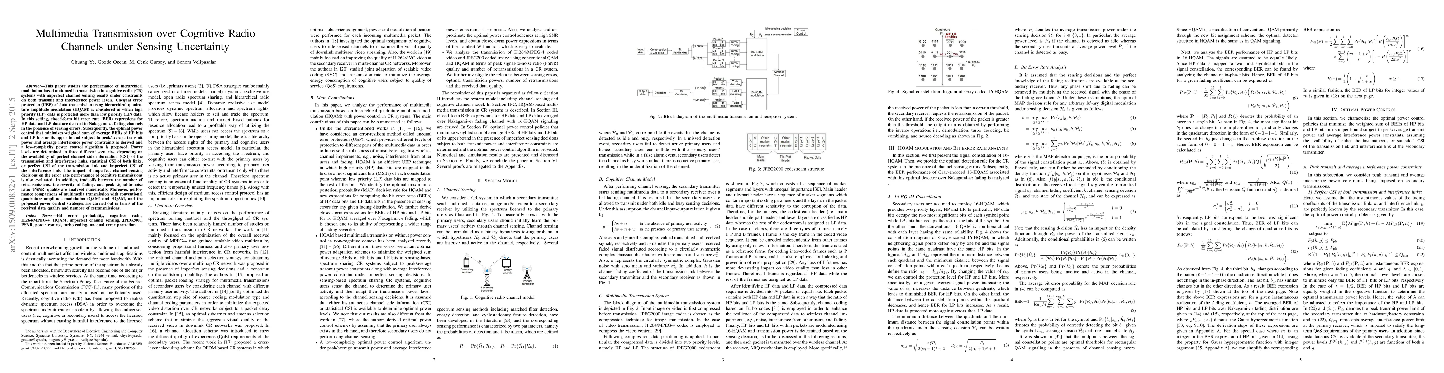 This paper investigates multimedia transmission over cognitive radio channels under sensing uncertainty, deriving closed-form BER expressions for hierarchical modulation and proposing optimal power control strategies to minimize error rates while considering transmit and interference power constraints. The study evaluates the impact of sensing errors and compares performance with conventional modulation techniques.