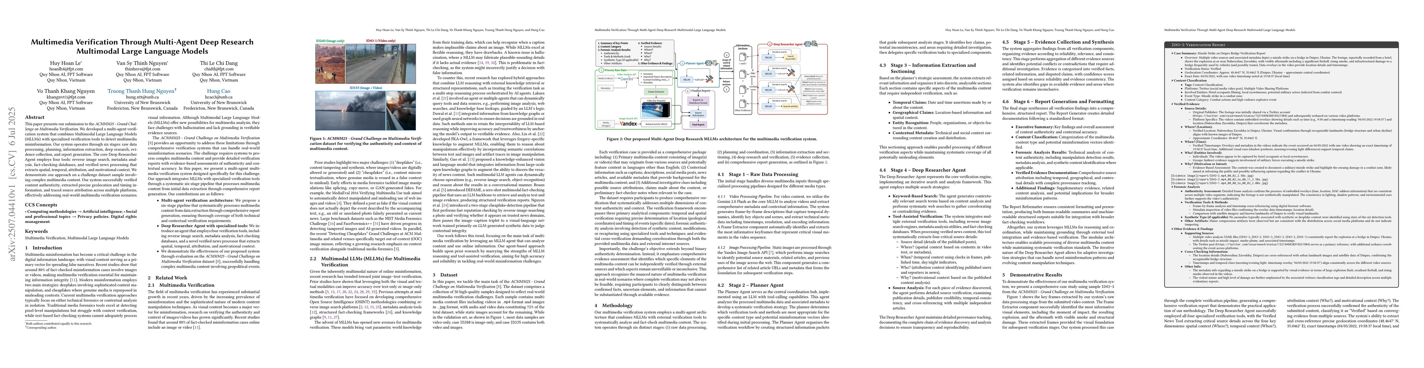 This paper presents our submission to the ACMMM25 - Grand Challenge on Multimedia Verification. We developed a multi-agent verification system that combines Multimodal Large Language Models (MLLMs) with specialized verification tools to detect multimedia misinformation. Our system operates through six stages: raw data processing, planning, information extraction, deep research, evidence collection, and report generation. The core Deep Researcher Agent employs four tools: reverse image search, metadata analysis, fact-checking databases, and verified news processing that extracts spatial, temporal, attribution, and motivational context. We demonstrate our approach on a challenge dataset sample involving complex multimedia content. Our system successfully verified content authenticity, extracted precise geolocation and timing information, and traced source attribution across multiple platforms, effectively addressing real-world multimedia verification scenarios.