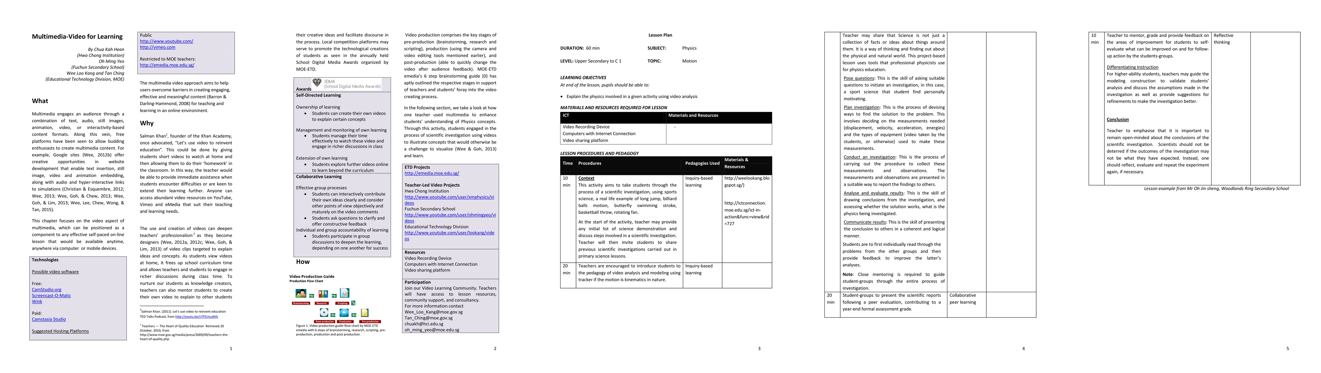 Multimedia engages an audience through a combination of text, audio, still images, animation, video, or interactivity-based content formats. Along this vein, free platforms have been seen to allow budding enthusiasts to create multimedia content. For example, Google sites (Wee, 2012b) offer creative opportunities in website development that enable text insertion, still image, video and animation embedding, along with audio and hyper-interactive links to simulations (Christian & Esquembre, 2012; Wee, 2013; Wee, Goh, & Chew, 2013; Wee, Goh, & Lim, 2013; Wee, Lee, Chew, Wong, & Tan, 2015). This chapter focuses on the video aspect of multimedia, which can be positioned as a component to any effective self-paced on-line lesson that would be available anytime, anywhere via computer or mobile devices. The multimedia video approach aims to help users overcome barriers in creating engaging, effective and meaningful content (Barron & Darling-Hammond, 2008) for teaching and learning in an online environment.