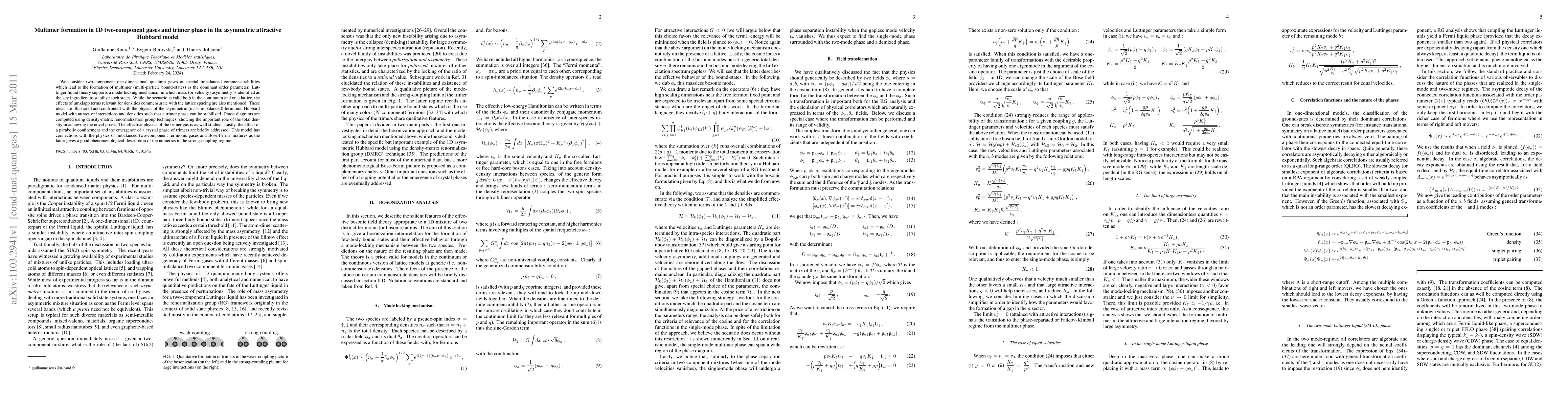 We consider two-component one-dimensional quantum gases at special imbalanced commensurabilities which lead to the formation of multimer (multi-particle bound-states) as the dominant order parameter. Luttinger liquid theory supports a mode-locking mechanism in which mass (or velocity) asymmetry is identified as the key ingredient to stabilize such states. While the scenario is valid both in the continuum and on a lattice, the effects of umklapp terms relevant for densities commensurate with the lattice spacing are also mentioned. These ideas are illustrated and confronted with the physics of the asymmetric (mass-imbalanced) fermionic Hubbard model with attractive interactions and densities such that a trimer phase can be stabilized. Phase diagrams are computed using density-matrix renormalization group techniques, showing the important role of the total density in achieving the novel phase. The effective physics of the trimer gas is as well studied. Lastly, the effect of a parabolic confinement and the emergence of a crystal phase of trimers are briefly addressed. This model has connections with the physics of imbalanced two-component fermionic gases and Bose-Fermi mixtures as the latter gives a good phenomenological description of the numerics in the strong-coupling regime.