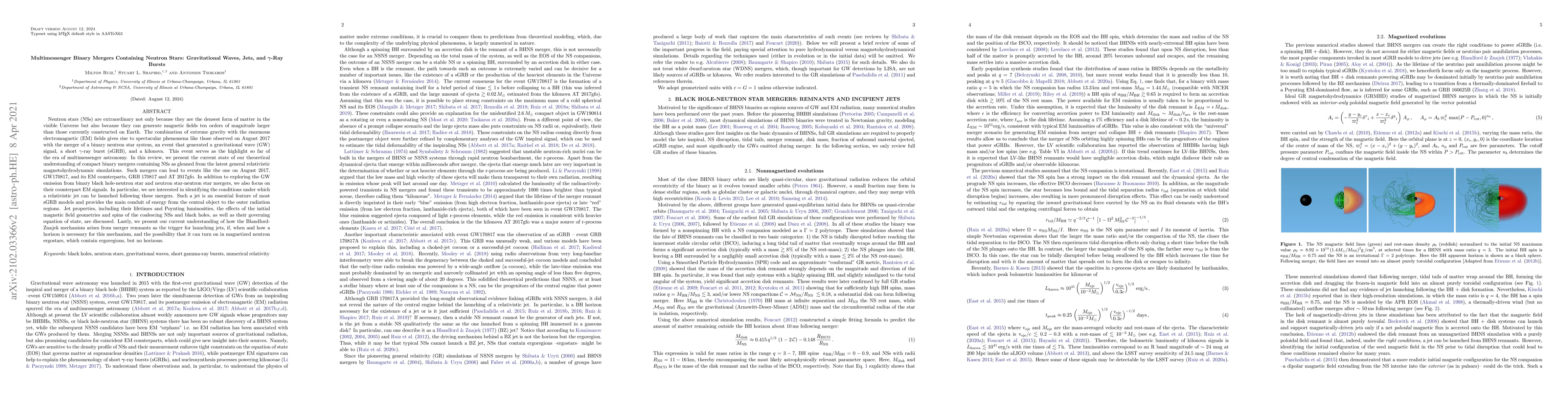 Neutron stars (NSs) are extraordinary not only because they are the densest form of matter in the visible Universe but also because they can generate B-fields ten orders of magnitude larger than those currently constructed on Earth. The combination of extreme gravity with the enormous electromagnetic (EM) fields gives rise to spectacular phenomena like those observed on August 2017 with the merger of a binary neutron star (NSNS) system, an event that generated a gravitational wave (GW) signal, a short $\gamma$-ray burst (sGRB), and a kilonova. This event serves as the highlight so far of the era of multimessenger astronomy. In this review, we present the current state of our theoretical understanding of compact binary mergers containing NSs as gleaned from the latest general relativistic magnetohydrodynamic simulations. Such mergers can lead to events like the one on August 2017, GW170817, and its EM counterparts, GRB 170817 and AT 2017gfo. In addition to exploring the GW emission from binary black hole-neutron star and NSNS mergers, we also focus on their counterpart EM signals. In particular, we are interested in identifying the conditions under which a relativistic jet can be launched following these mergers. Such a jet is an essential feature of most sGRB models and provides the main conduit of energy from the central object to the outer radiation regions. Jet properties, including their lifetimes and Poynting luminosities, the effects of the initial B-field geometries and spins of the coalescing NSs, as well as their governing equation of state, are discussed. Lastly, we present our current understanding of how the Blandford-Znajek mechanism arises from merger remnants as the trigger for launching jets, if, when and how a horizon is necessary for this mechanism, and the possibility that it can turn on in magnetized neutron ergostars, which contain ergoregions, but no horizons.