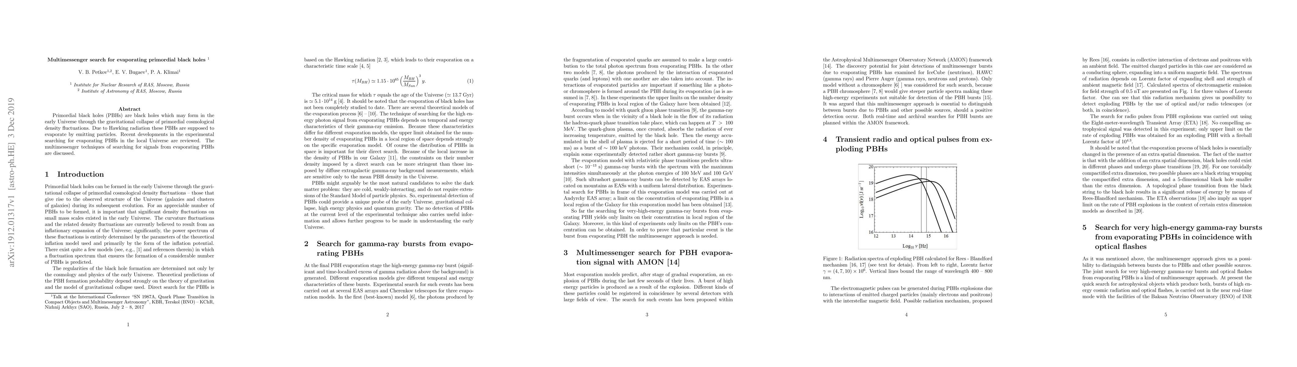 Primordial black holes (PBHs) are black holes which may form in the early Universe through the gravitational collapse of primordial cosmological density fluctuations. Due to Hawking radiation these PBHs are supposed to evaporate by emitting particles. Recent developments in the experimental searching for evaporating PBHs in the local Universe are reviewed. The multimessenger techniques of searching for signals from evaporating PBHs are discussed.