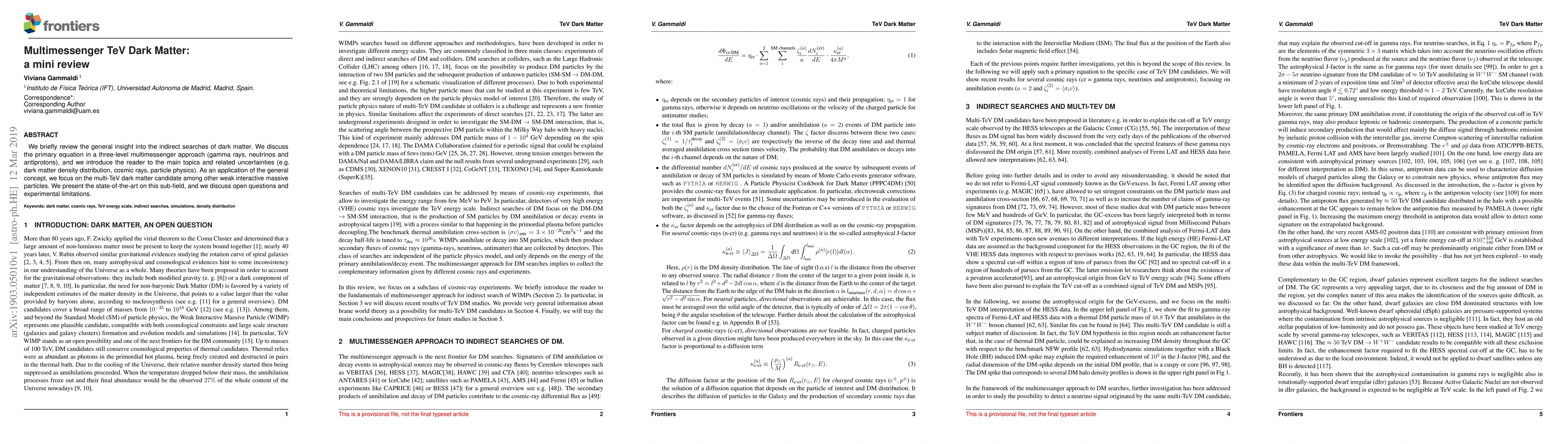 We briefly review the general insight into the indirect searches of dark matter. We discuss the primary equation in a three-level multimessenger approach (gamma rays, neutrinos and antiprotons), and we introduce the reader to the main topics and related uncertainties (e.g. dark matter density distribution, cosmic rays, particle physics). As an application of the general concept, we focus on the multi-TeV dark matter candidate among other weak interactive massive particles. We present the state-of-the-art on this sub-field, and we discuss open questions and experimental limitations.