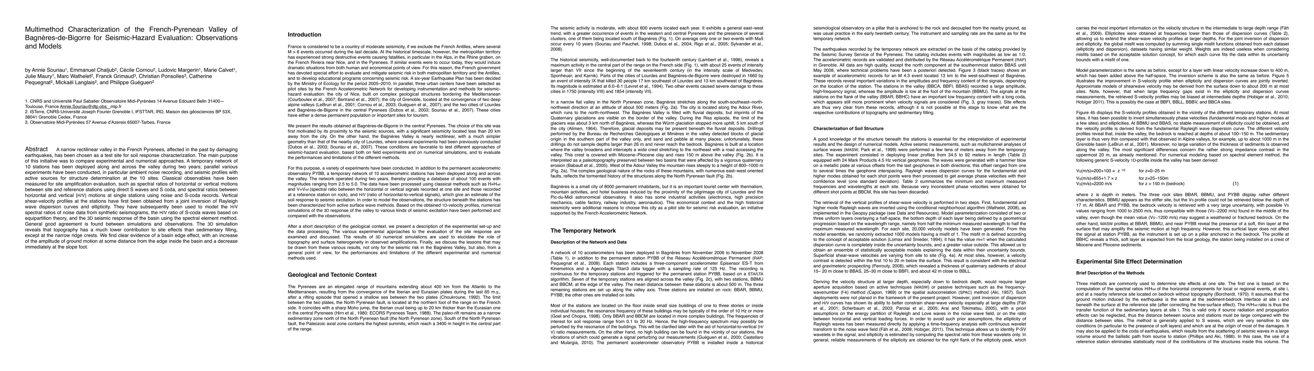 A narrow rectilinear valley in the French Pyrenees, affected in the past by damaging earthquakes, has been chosen as a test site for soil response characterization. The main purpose of this initiative was to compare experimental and numerical approaches. A temporary network of 10 stations has been deployed along and across the valley during two years; parallel various experiments have been conducted, in particular ambient noise recording, and seismic profiles with active sources for structure determination at the 10 sites. Classical observables have been measured for site amplification evaluation, such as spectral ratios of horizontal or vertical motions between site and reference stations using direct S waves and S coda, and spectral ratios between horizontal and vertical (H/V) motions at single stations using noise and S-coda records. Vertical shear-velocity profiles at the stations have first been obtained from a joint inversion of Rayleigh wave dispersion curves and ellipticity. They have subsequently been used to model the H/V spectral ratios of noise data from synthetic seismograms, the H/V ratio of S-coda waves based on equipartition theory, and the 3D seismic response of the basin using the spectral element method. General good agreement is found between simulations and observations. The 3D simulation reveals that topography has a much lower contribution to site effects than sedimentary filling, except at the narrow ridge crests. We find clear evidence of a basin edge effect, with an increase of the amplitude of ground motion at some distance from the edge inside the basin and a decrease immediately at the slope foot.