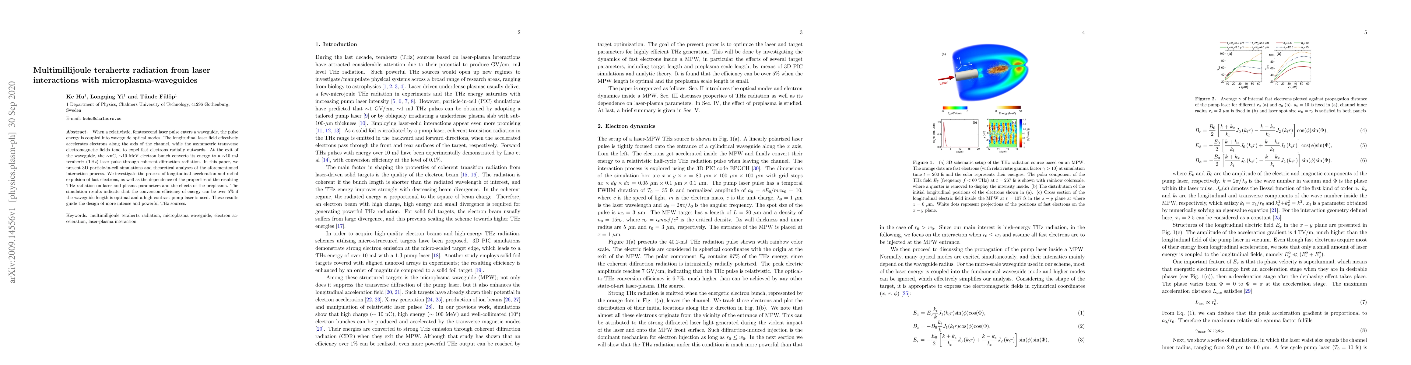 When a relativistic, femtosecond laser pulse enters a waveguide, the pulse energy is coupled into waveguide optical modes. The longitudinal laser field effectively accelerates electrons along the axis of the channel, while the asymmetric transverse electromagnetic fields tend to expel fast electrons radially outwards. At the exit of the waveguide, the $\sim$${\rm nC}$, $\sim$$10\ {\rm MeV}$ electron bunch converts its energy to a $\sim$$10\ {\rm mJ}$ terahertz (THz) laser pulse through coherent diffraction radiation. In this paper, we present 3D particle-in-cell simulations and theoretical analyses of the aforementioned interaction process. We investigate the process of longitudinal acceleration and radial expulsion of fast electrons, as well as the dependence of the properties of the resulting THz radiation on laser and plasma parameters and the effects of the preplasma. The simulation results indicate that the conversion efficiency of energy can be over $5\%$ if the waveguide length is optimal and a high contrast pump laser is used. These results guide the design of more intense and powerful THz sources.