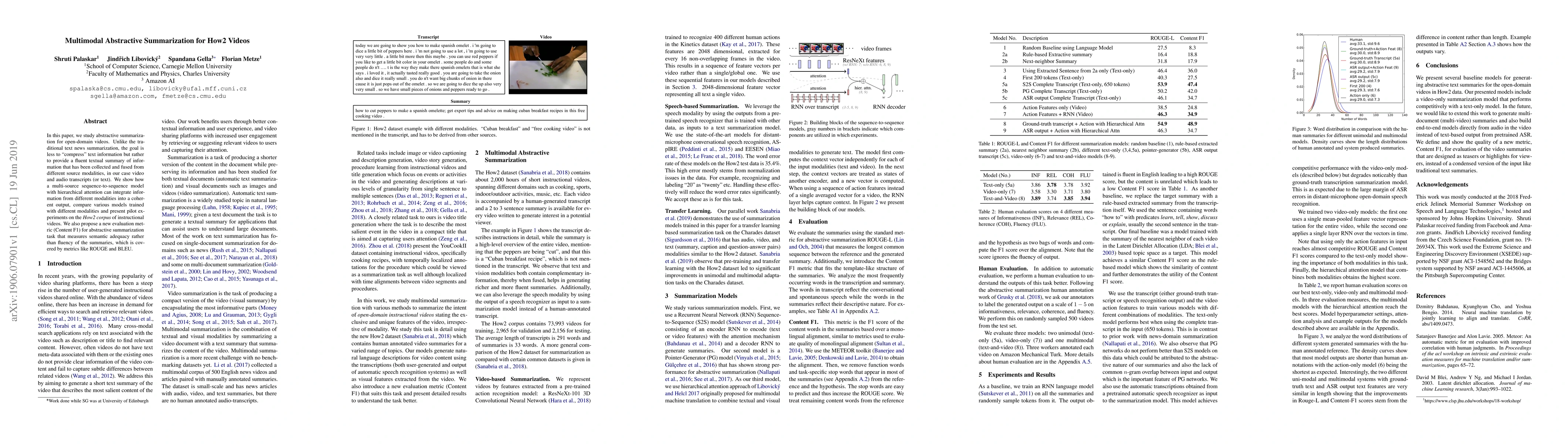 This paper investigates abstractive summarization for instructional How2 videos, focusing on generating fluent summaries from video and audio transcripts. It introduces a multi-source sequence-to-sequence model with hierarchical attention, evaluates different model variants, and proposes a new Content F1 metric for assessing semantic adequacy of summaries.