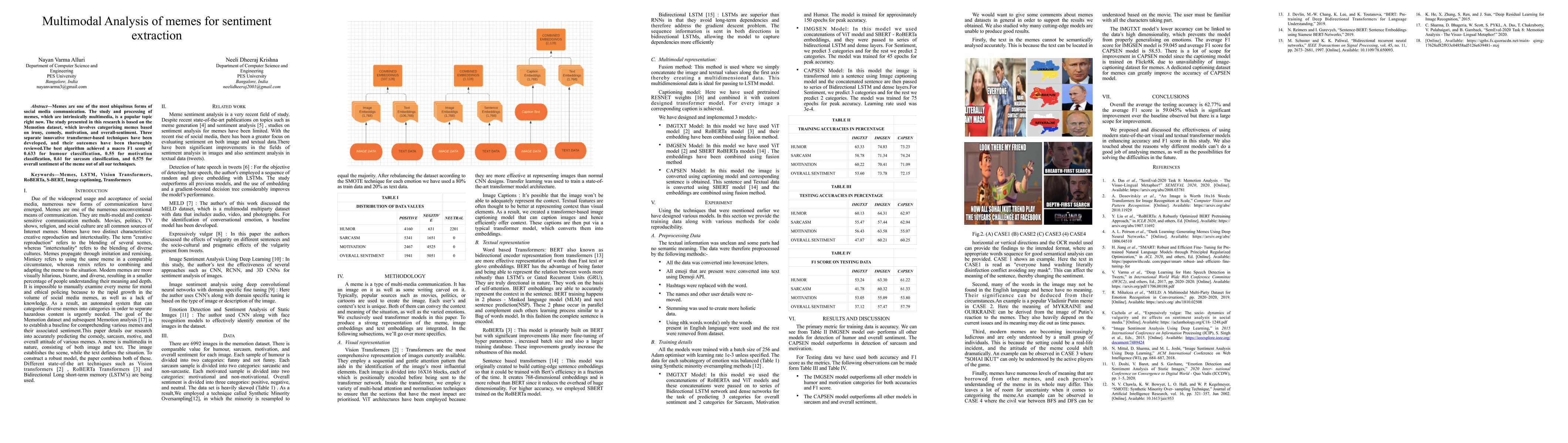 Memes are one of the most ubiquitous forms of social media communication. The study and processing of memes, which are intrinsically multimedia, is a popular topic right now. The study presented in this research is based on the Memotion dataset, which involves categorising memes based on irony, comedy, motivation, and overall-sentiment. Three separate innovative transformer-based techniques have been developed, and their outcomes have been thoroughly reviewed.The best algorithm achieved a macro F1 score of 0.633 for humour classification, 0.55 for motivation classification, 0.61 for sarcasm classification, and 0.575 for overall sentiment of the meme out of all our techniques.