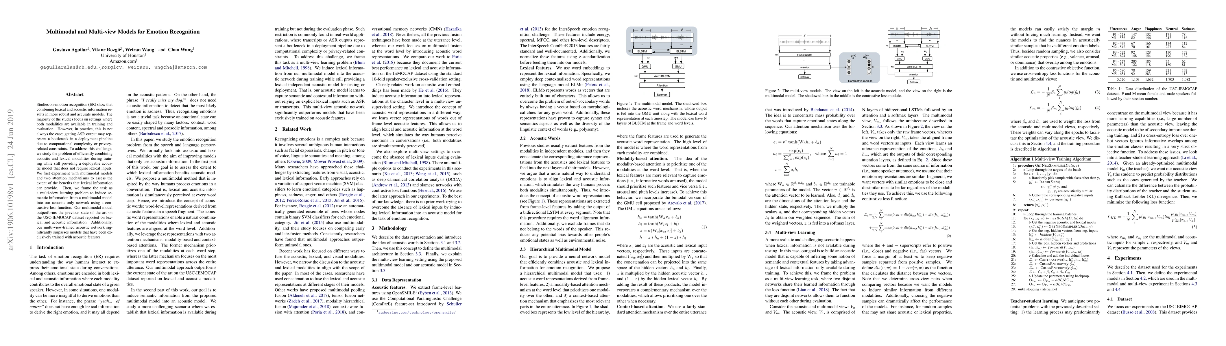 Studies on emotion recognition (ER) show that combining lexical and acoustic information results in more robust and accurate models. The majority of the studies focus on settings where both modalities are available in training and evaluation. However, in practice, this is not always the case; getting ASR output may represent a bottleneck in a deployment pipeline due to computational complexity or privacy-related constraints. To address this challenge, we study the problem of efficiently combining acoustic and lexical modalities during training while still providing a deployable acoustic model that does not require lexical inputs. We first experiment with multimodal models and two attention mechanisms to assess the extent of the benefits that lexical information can provide. Then, we frame the task as a multi-view learning problem to induce semantic information from a multimodal model into our acoustic-only network using a contrastive loss function. Our multimodal model outperforms the previous state of the art on the USC-IEMOCAP dataset reported on lexical and acoustic information. Additionally, our multi-view-trained acoustic network significantly surpasses models that have been exclusively trained with acoustic features.