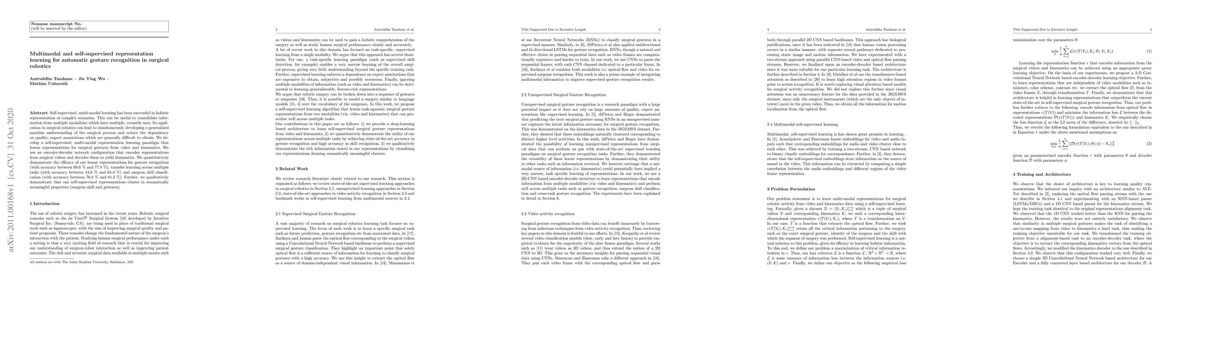 This paper presents a self-supervised, multi-modal representation learning approach for automatic gesture recognition in surgical robotics, achieving high accuracy in gesture recognition, transfer learning, and surgeon skill classification. The method effectively consolidates information from video and kinematics without relying on expert annotations.