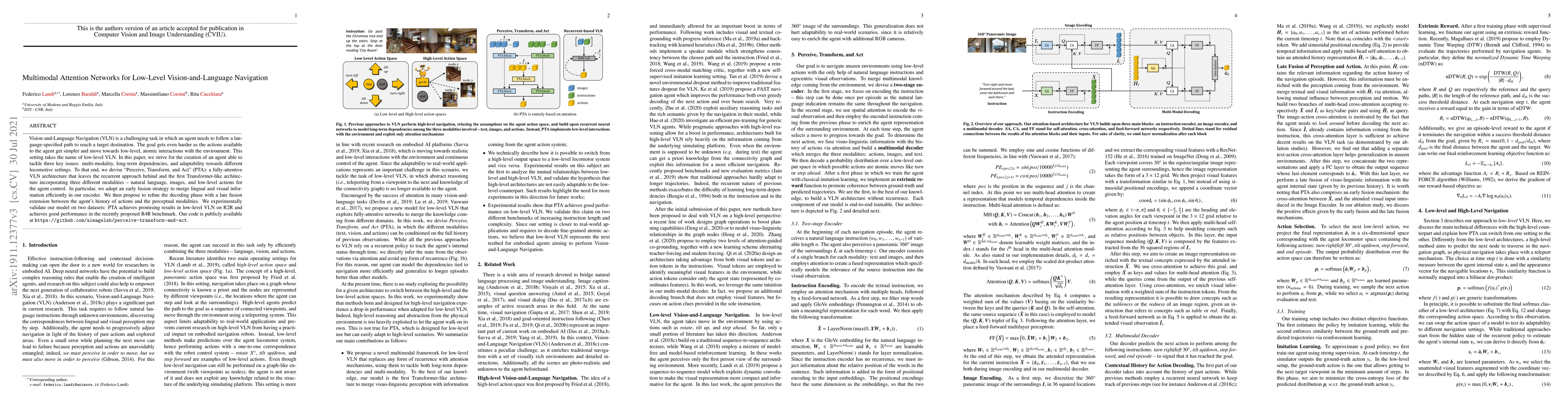 Vision-and-Language Navigation (VLN) is a challenging task in which an agent needs to follow a language-specified path to reach a target destination. The goal gets even harder as the actions available to the agent get simpler and move towards low-level, atomic interactions with the environment. This setting takes the name of low-level VLN. In this paper, we strive for the creation of an agent able to tackle three key issues: multi-modality, long-term dependencies, and adaptability towards different locomotive settings. To that end, we devise "Perceive, Transform, and Act" (PTA): a fully-attentive VLN architecture that leaves the recurrent approach behind and the first Transformer-like architecture incorporating three different modalities - natural language, images, and low-level actions for the agent control. In particular, we adopt an early fusion strategy to merge lingual and visual information efficiently in our encoder. We then propose to refine the decoding phase with a late fusion extension between the agent's history of actions and the perceptual modalities. We experimentally validate our model on two datasets: PTA achieves promising results in low-level VLN on R2R and achieves good performance in the recently proposed R4R benchmark. Our code is publicly available at https://github.com/aimagelab/perceive-transform-and-act.