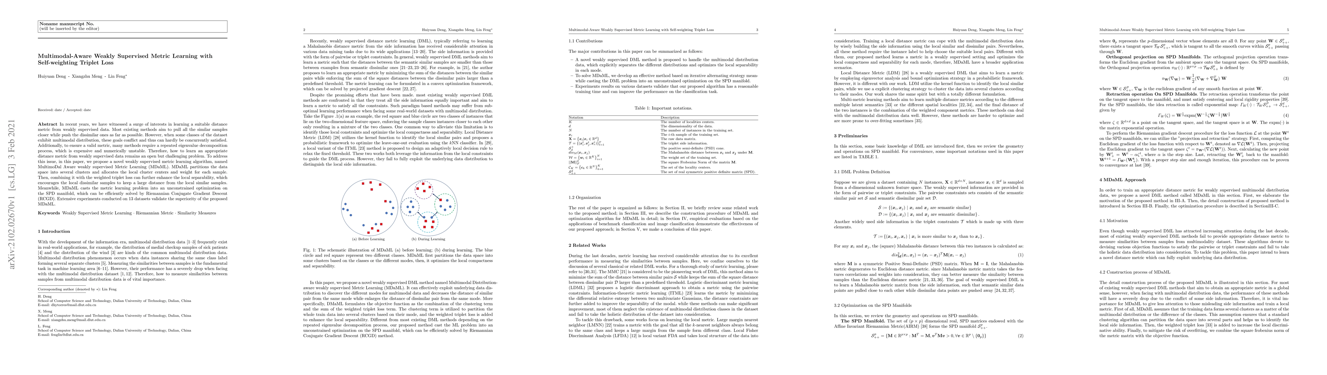 This paper introduces a novel weakly supervised metric learning method called Multimodal Aware weakly supervised Metric Learning (MDaML) that employs self-weighting and a weighted triplet loss to enhance local separability, especially for multimodal classes, and efficiently solves the metric learning problem on the SPD manifold using Riemannian Conjugate Gradient Descent. Experiments on 13 datasets demonstrate its effectiveness.
