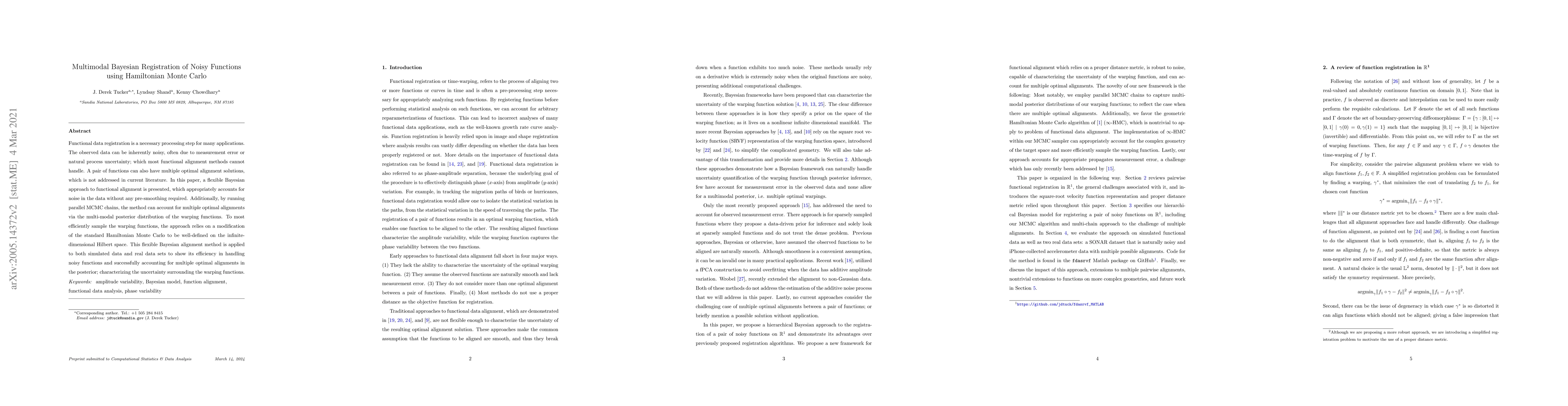 This paper introduces a Bayesian method for multimodal functional data registration that handles noisy data without pre-smoothing. It employs a modified Hamiltonian Monte Carlo to efficiently sample from the multi-modal posterior distribution of warping functions, demonstrating effectiveness on both simulated and real datasets.